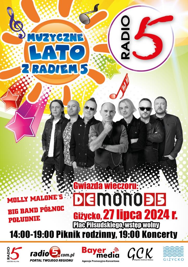 27 lipca Muzyczne Lato z Radiem 5 -od 14:00 do 19:00 Piknik Rodzinny na placu Piłsudskiego, wieczorem koncerty – lokalne grupy Molly Mallone’s oraz Big Band Północ Południe Group. Gwiazdą wieczoru będzie zespół De Mono 35! [WSTĘP WOLNY]