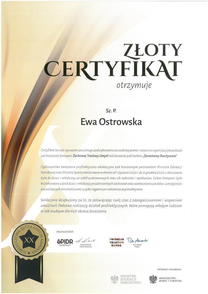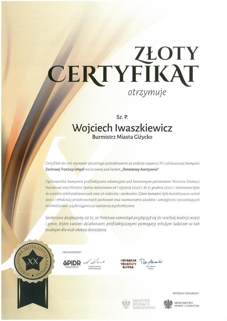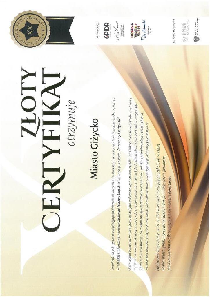 Z biura organizatora kampanii dotarły także Złote Certyfikaty dla Miasta Giżycka, Burmistrza Wojciecha Karola Iwaszkiewicza i Dyrektor Ewy Ostrowskiej. Certyfikat otrzymały także pani Paulina Szachniuk-Albowicz i Szkoła Podstawowa nr 3. Certyfikaty te są wyrazem specjalnego podziękowania za pomoc i wsparcie organizacyjne podczas jubileuszowej kampanii Zachowaj Trzeźwy Umysł realizowanej pod hasłem „Dorastamy asertywnie”.