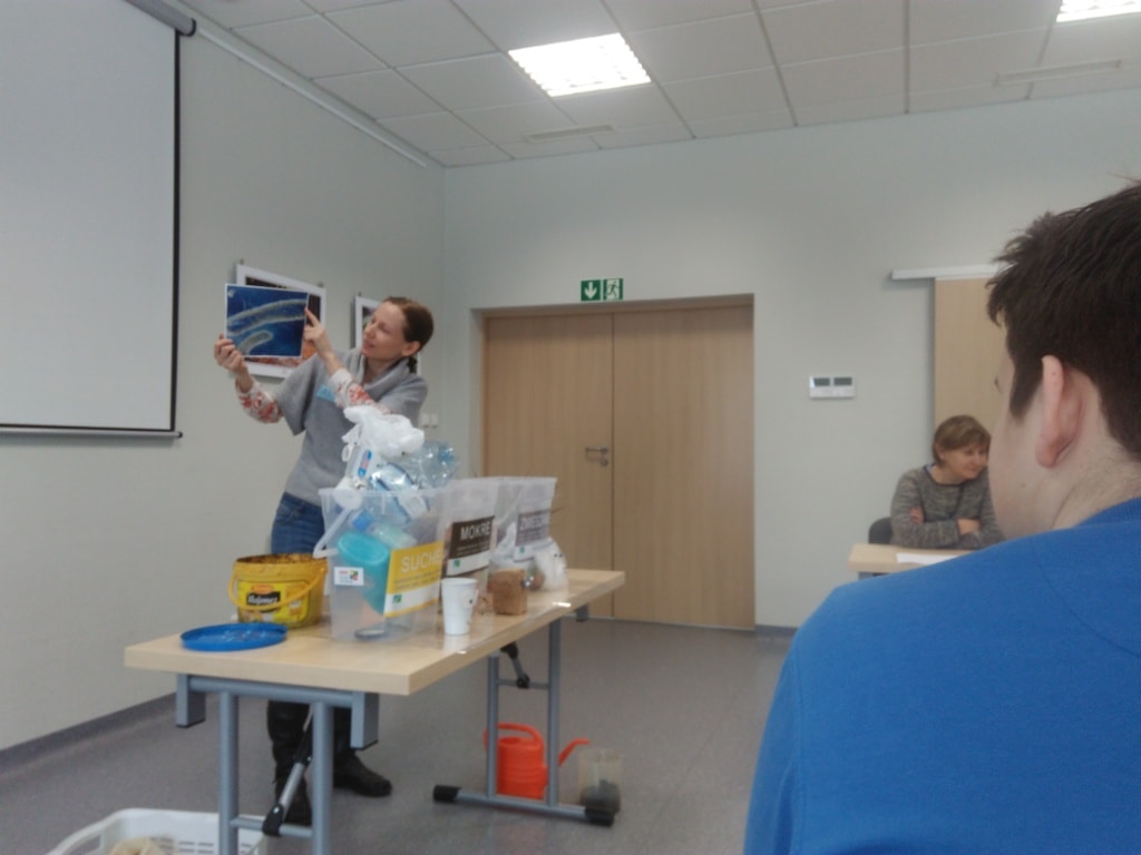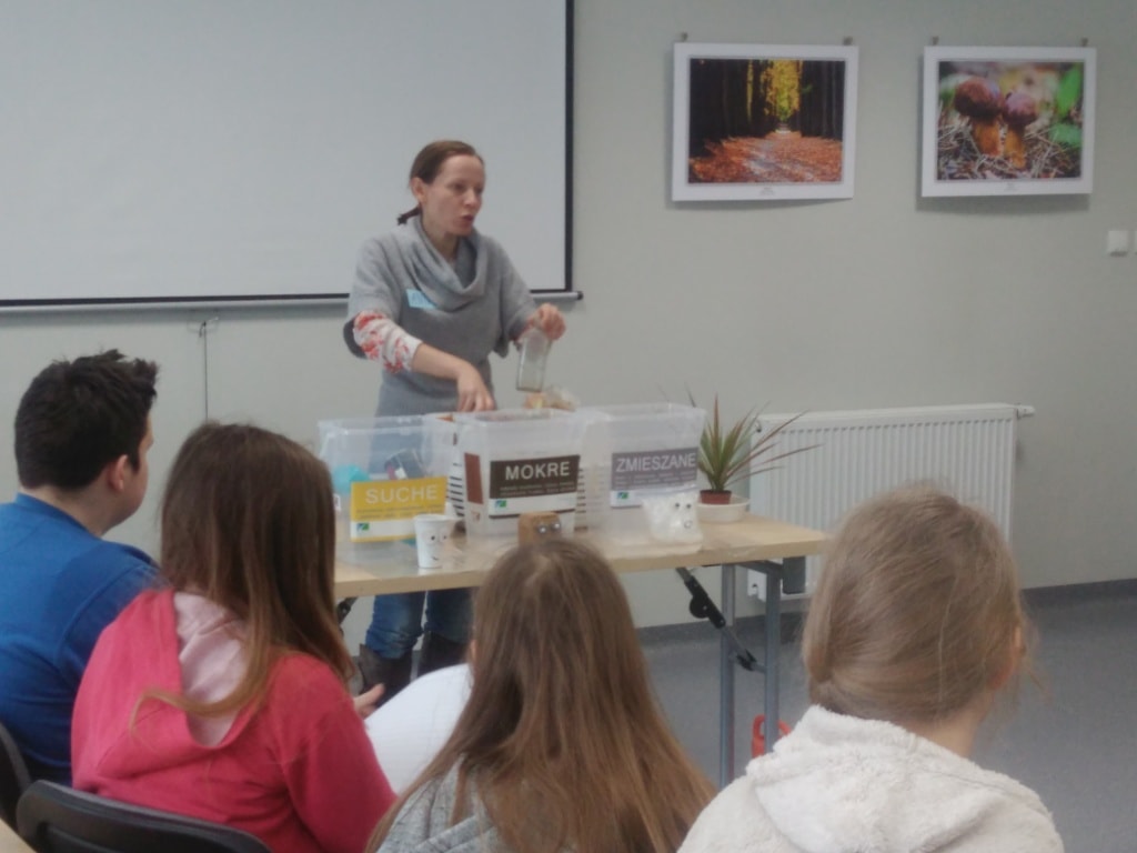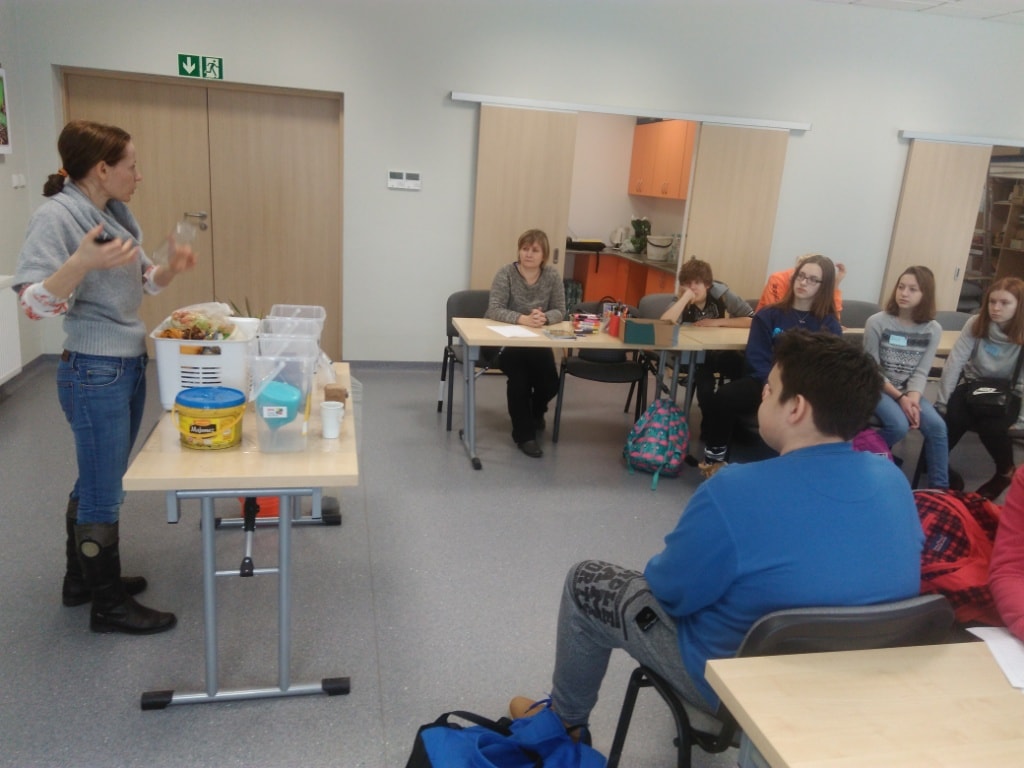 W części warsztatowej zajęła się nami pani Anna Baranowska omawiając zasady segregacji odpadów domowych i proces kompostowania. Szczególną uwagę zwróciła na ogromne znaczenie bakterii kompostowych (reducentów), które wykonują gigantyczną pracę przywracając środowisku minerały niezbędne do wzrostu roślin.