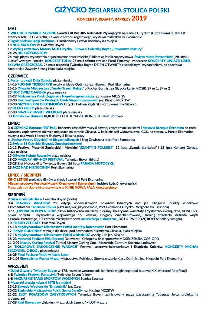 Urząd Miasta Giżycko opublikował kalendarz imprez na sezon letni 2019. Na turystów i mieszkańców czeka sporo imprez zaplanowanych od maja do września.