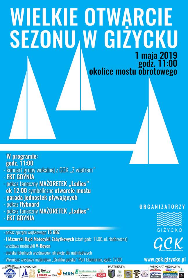 - 1 maja WIELKIE OTWARCIE SEZONU przy moście obrotowym w Giżycku, połączone z symbolicznym otwarciem i Paradą Jednostek Pływających na kanale Łuczańskim