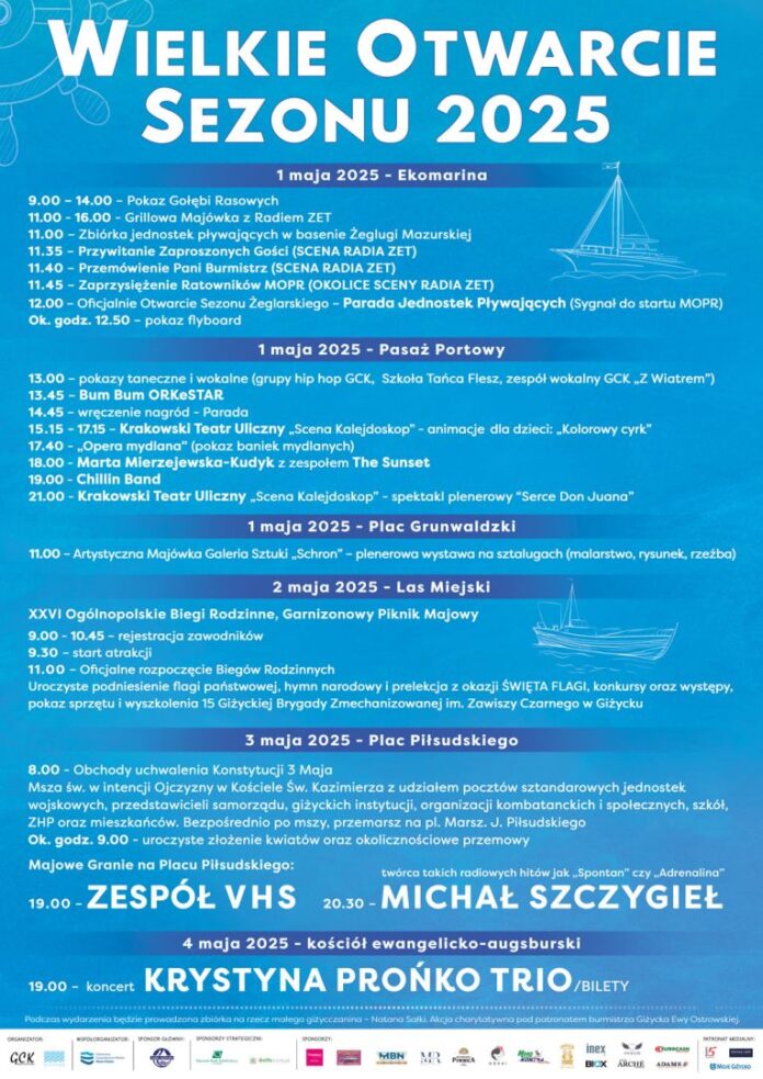 Majówkę tradycyjnie rozpocznie Wielkie Otwarcie Sezonu, jedno z najważniejszych i najbardziej wyczekiwanych wydarzeń w giżyckim kalendarzu imprez. Z uwagi na trwający remont mostu obrotowego nad Kanałem Łuczańskim, główne atrakcje tego dnia będą skoncentrowane wokół Ekomariny i Plaży Miejskiej.