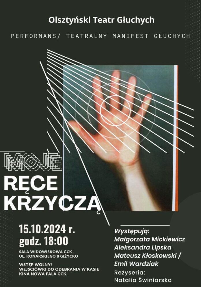 Olsztyński Teatr Głuchych oraz Giżyckie Centrum Kultury zaprasza na: Performans/ teatralny manifest g/Głuchych MOJE RĘCE KRZYCZĄ. 15.10.2024 r., godz. 18:00 w sali widowiskowej GCK Bezpłatne wejściówki do odbioru od 1 października 2024 r. w kasie kina Nowa Fala, w godzinach 9:00 – 15:00.