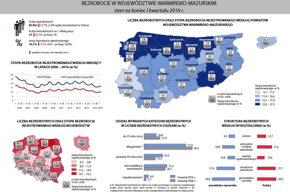 Jak podaje Główny Urząd Statystyczny na koniec I kwartału 2016 roku stopa bezrobocia w województwie warmińsko – mazurskim wyniosła 16,5 procenta. To spadek o 2,3 procenta w porównaniu do analogicznego okresu sprzed roku. Zarejestrowanych osób bez pracy było prawie 86 tys. Na jedną ofertę pracy na Warmii i Mazurach przypadało 33 bezrobotnych.