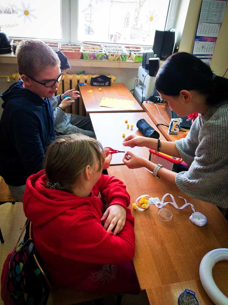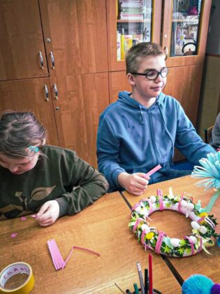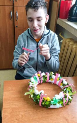 Uczniowie z niepełnosprawnością intelektualną samodzielnie wykonali stroik świąteczny oraz palmę, która ma być namiastką świąt Wielkanocy wszystkim żołnierzom w trakcie realizacji zadań.