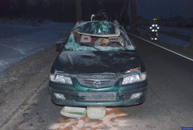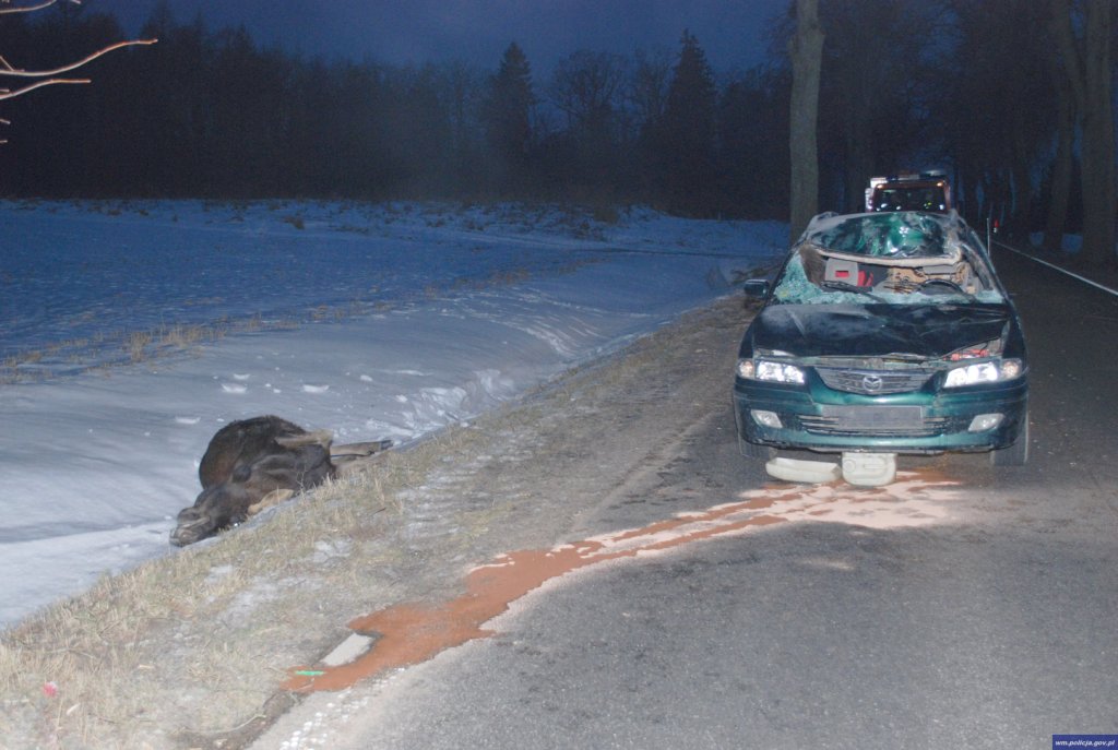 Policjanci pracowali na miejscu zdarzenia drogowego, do którego doszło na drodze wojewódzkiej W-650, za miejscowością Leśniewo, w kierunku Węgorzewa. Kierujący osobową mazdą zderzył się z łosiem. Siła uderzenia była tak duża, że zwierzę zginęło na miejscu. Auto natomiast zostało poważnie uszkodzone. Siedzący za kierownicą 53-latek z obrażeniami twarzy został przewieziony do Szpitala Powiatowego w Giżycku.