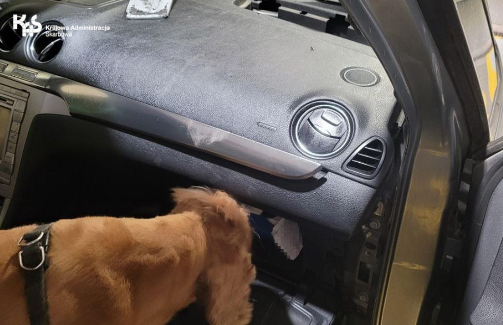 Wyszkolona do wykrywania wyrobów tytoniowych Moli wskazała, że w konsoli od strony kierowcy, podszybiu oraz zbiorniku na płyn do spryskiwaczy mogą znajdować się papierosy.