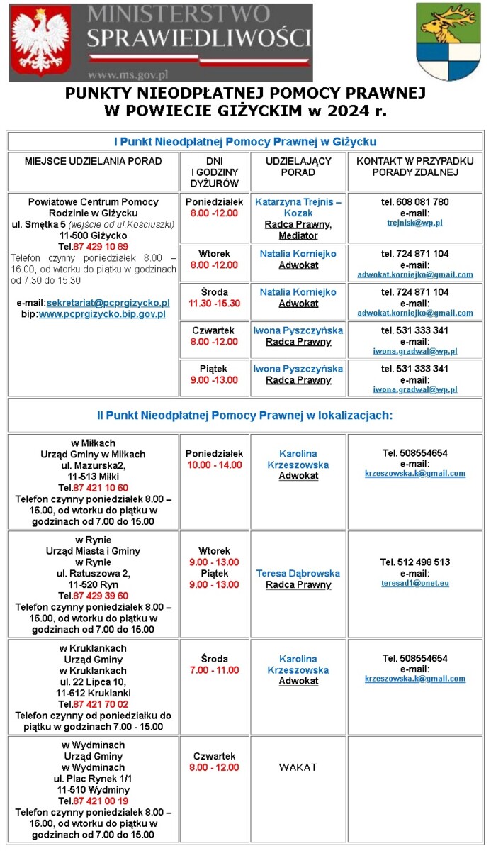 Również w 2024 roku mieszkańcy Powiatu Giżyckiego mogą skorzystać z usług nieodpłatnej pomocy prawnej, poradnictwa obywatelskiego lub mediacji.