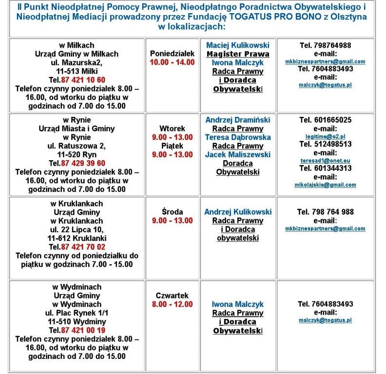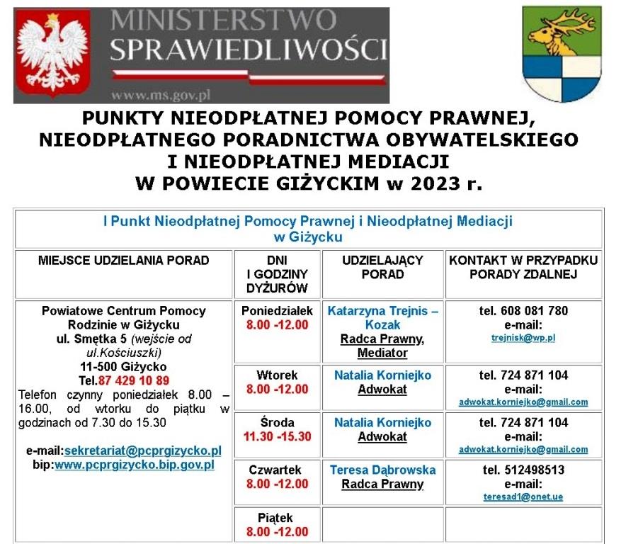Punkty nieodpłatnej pomocy prawnej, nieodpłatnego poradnictwa obywatelskiego i nieodpłatnej mediacji w powiecie giżyckim w 2023 r.