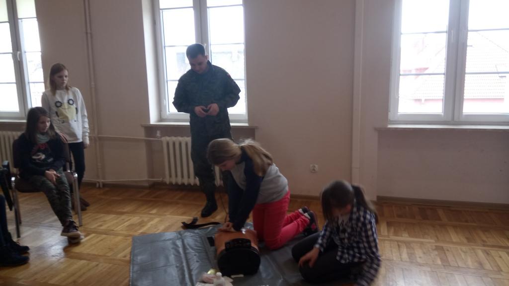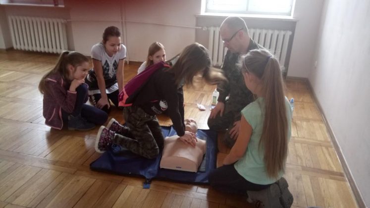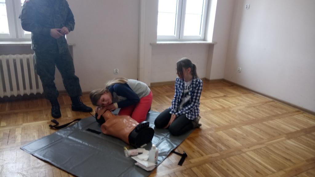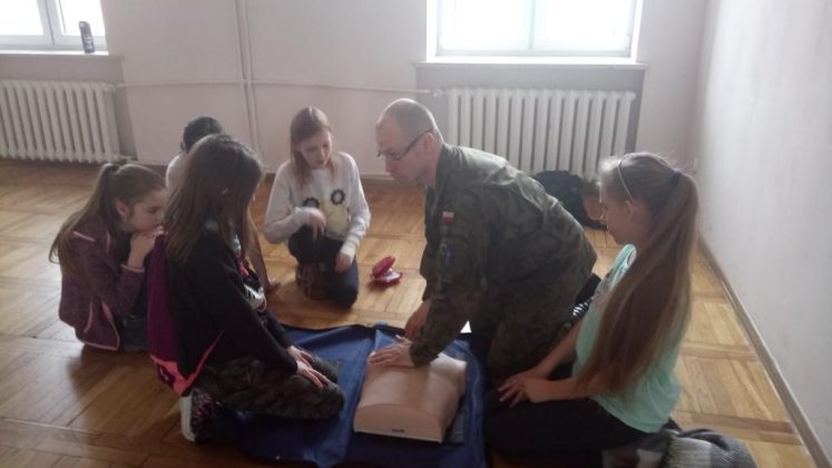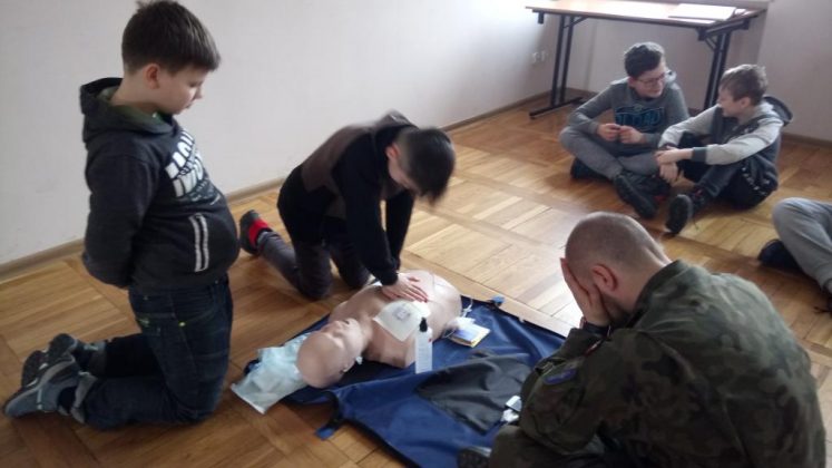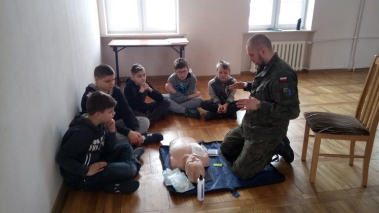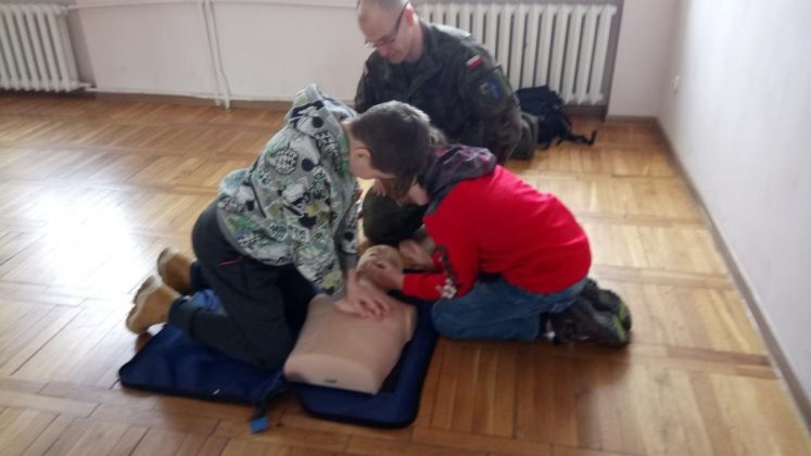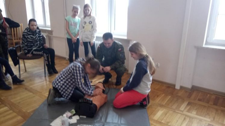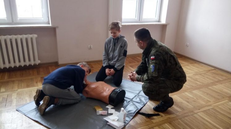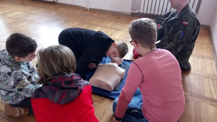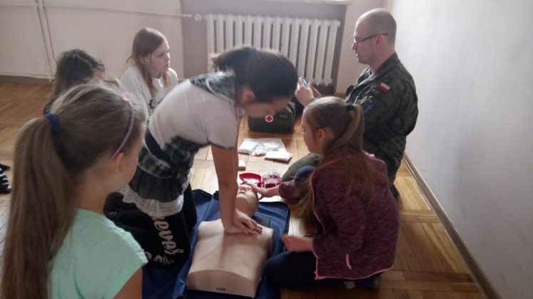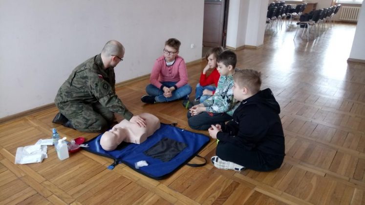 Żołnierze z 15 Giżyckiej Brygady Zmechanizowanej przybliżyli podstawowe zasady postępowania w sytuacjach zagrożenia życia lub zdrowia. Następnie zademonstrowali na fantomie prawidłowe przeprowadzenie resuscytacji krążeniowo – oddechowej. Uczniowie dowiedzieli się też, na co należy zwrócić uwagę składając meldunek telefoniczny w razie wypadku. Chętne dzieci wzięły udział w części praktycznej, aby czynnie utrwalić zasady udzielania pierwszej pomocy. Uczniowie z dużym zainteresowaniem i zaangażowaniem wzięli udział w tej niezwykłej lekcji ratowania życia.