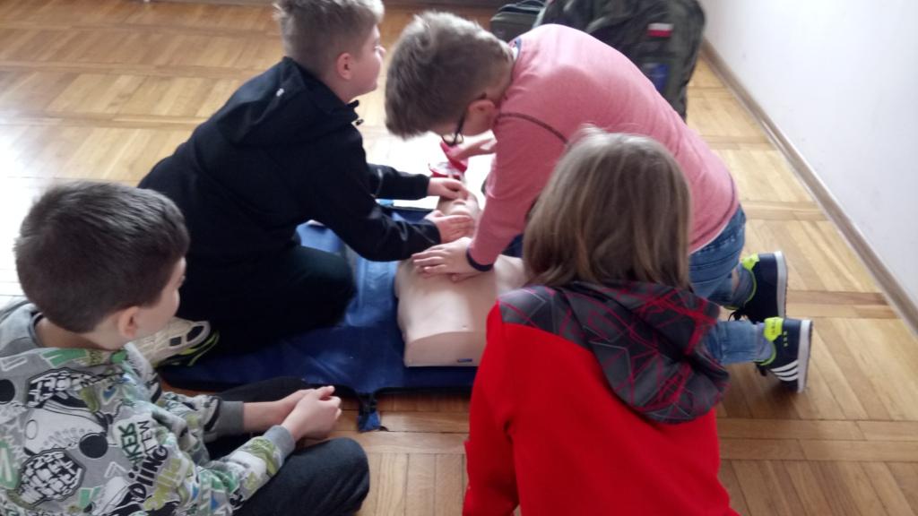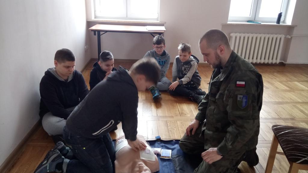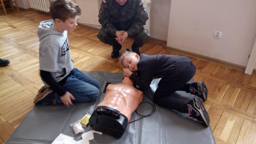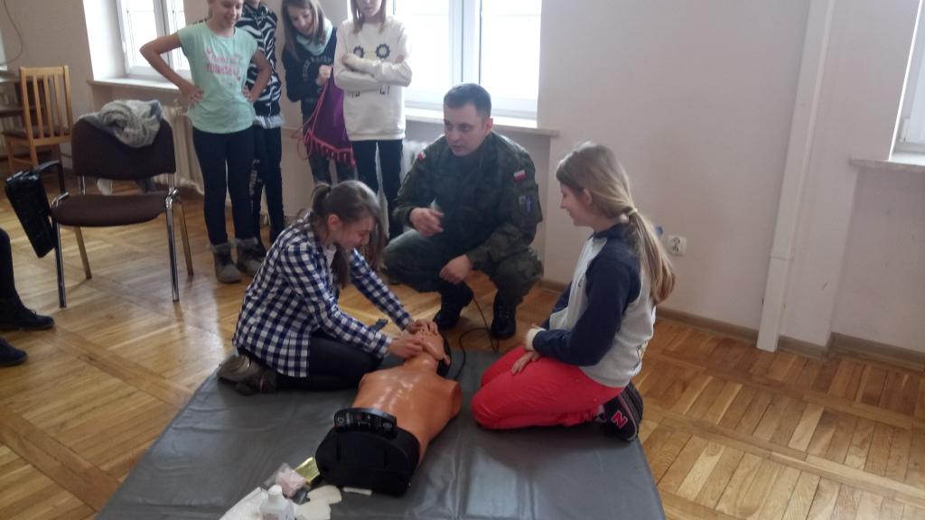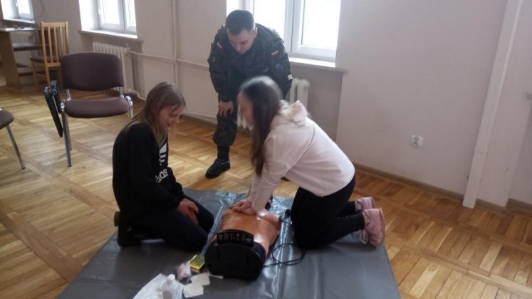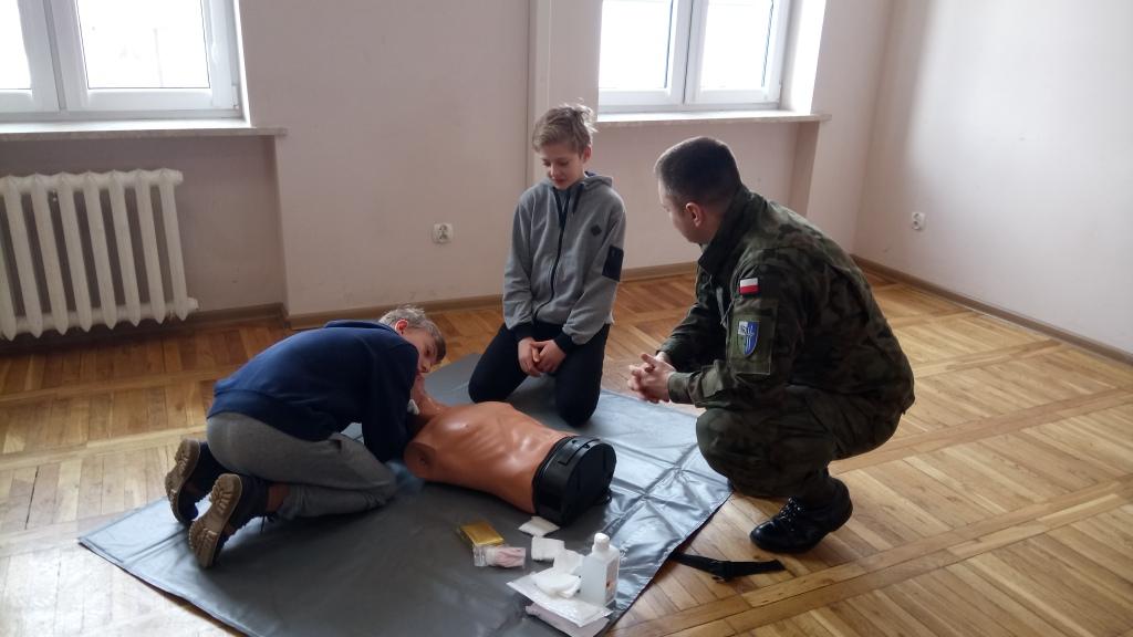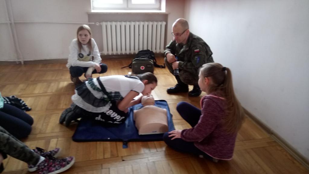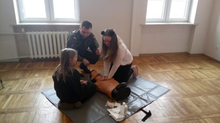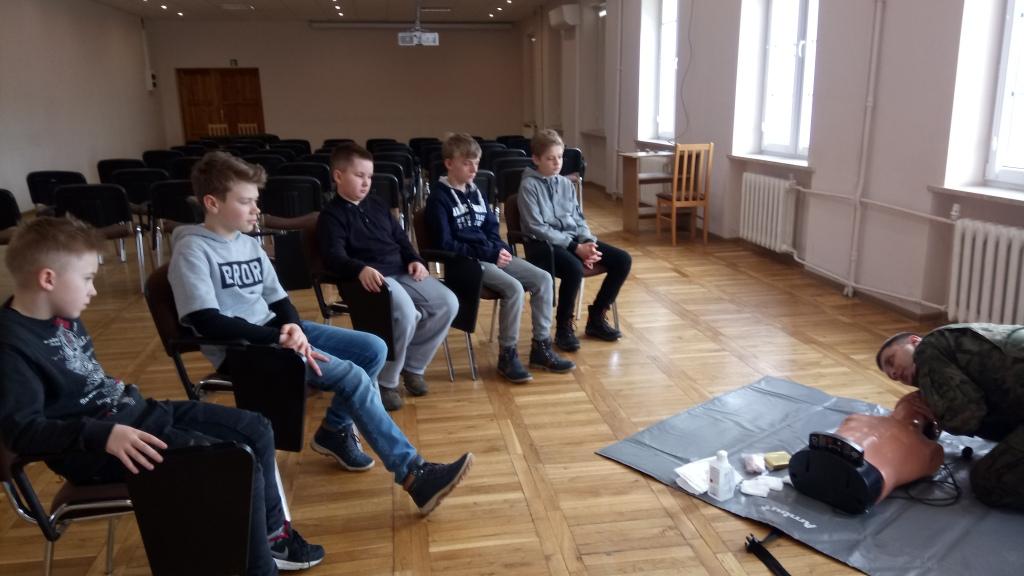 Żołnierze z 15 Giżyckiej Brygady Zmechanizowanej przybliżyli podstawowe zasady postępowania w sytuacjach zagrożenia życia lub zdrowia. Następnie zademonstrowali na fantomie prawidłowe przeprowadzenie resuscytacji krążeniowo – oddechowej. Uczniowie dowiedzieli się też, na co należy zwrócić uwagę składając meldunek telefoniczny w razie wypadku. Chętne dzieci wzięły udział w części praktycznej, aby czynnie utrwalić zasady udzielania pierwszej pomocy. Uczniowie z dużym zainteresowaniem i zaangażowaniem wzięli udział w tej niezwykłej lekcji ratowania życia.
