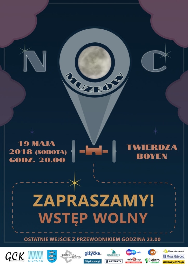 19 maja giżycka XIX-wieczna fortyfikacja włączy się do europejskiego wydarzenia jakim jest Noc Muzeów. Dołączymy w ten sposób do grona muzeów, fortyfikacji i zabytków, które bezpłatnie otwierają w tym dniu (a dokładnie późnym wieczorem) swe podwoje dla zwiedzających. Oficjalne rozpoczęcie wydarzenia w Twierdzy Boyen zaplanowano na godz. 20.00. Następnie grupy wyruszą z przewodnikami na zwiedzanie, które potrwa do ok. 24.00. Na zwiedzanie wyruszamy z dziedzińca Twierdzy, o pełnej godzinie i co godzinę aż do 23.00. Na trasie zwiedzania będzie można zobaczyć nowe wystawy w galerii Koszarowca Nr 1, w Stajni z Wozownią i w Laboratorium Prochowym oraz zapoznać się z ciekawą historią tego miejsca. Towarzyszyć nam będzie Gwardia Twierdzy – GRH 147. Pułk Piechoty.