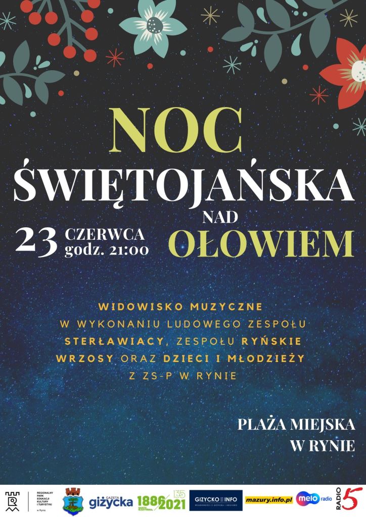 23 czerwca o godz. 21:00 na plaży miejskiej nad jeziorem Ołów w Rynie odbędzie się niesamowite widowisko muzyczne – Noc Świętojańska nad Ołowiem, w wykonaniu Ludowego Zespołu Sterławiacy, Zespołu Ryńskie Wrzosy oraz dzieci młodzieży z Zespołu Szkolno-Przedszkolnego w Rynie.