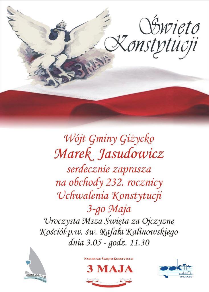 Wójt Gminy Giżycko Marek Jasudowicz serdecznie zaprasza na obchody 232. rocznicy uchwalenia Konstytucji 3 Maja.