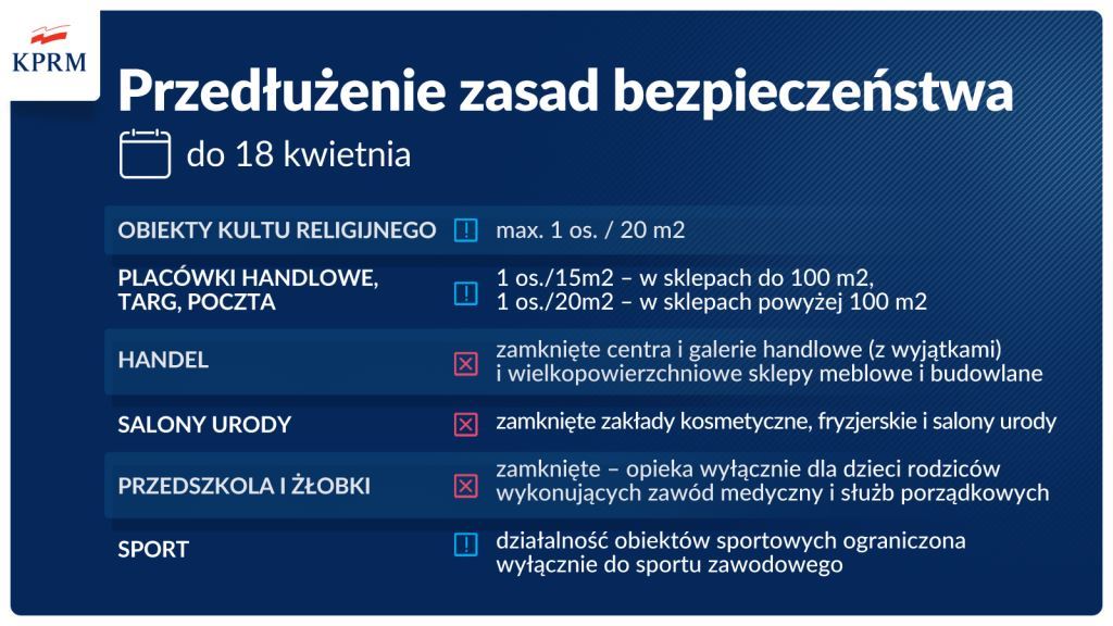 Podjęliśmy decyzję, że obostrzenia, które w tej chwili obowiązują zostaną przedłużone przez okres niewiele ponad tygodnia. Niewiele, bo chcemy żeby to był okres, który obejmuje też kolejny weekend. To przedłużenie zasad bezpieczeństwa będzie obowiązywało do 18 kwietnia. Potem będziemy podejmowali kolejną decyzję, co robić dalej – ogłosił Adam Niedzielski.