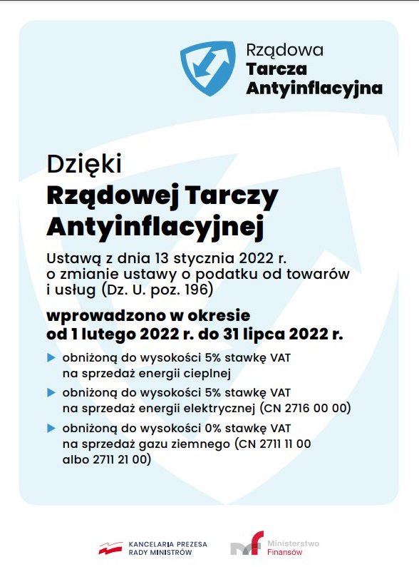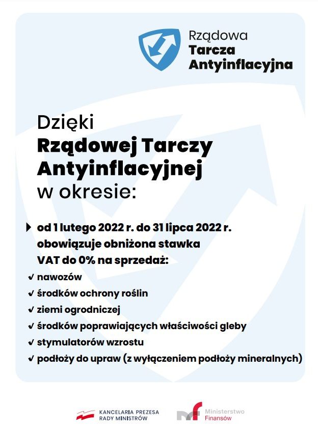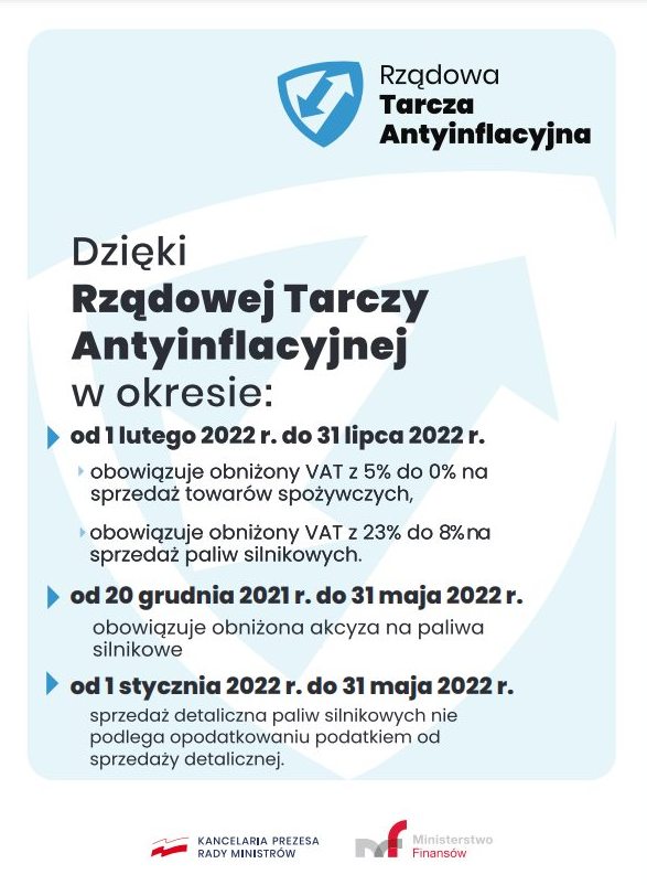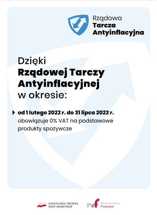 Uchwalona przez Sejm Tarcza Antyinflacyjna 2.0. przewiduje czasową obniżkę stawek podatku VAT na niektóre towary. To paliwa, autogaz, ciepło i energia elektryczna. Ponadto wprowadzi ona zerowy VAT na żywność, gaz ziemny oraz nawozy i inne wybrane środki wykorzystywane w produkcji rolniczej. Obniżki będą obowiązywać od 1 lutego 2022 r. na okres sześciu miesięcy, tj. do końca lipca 2022 r.