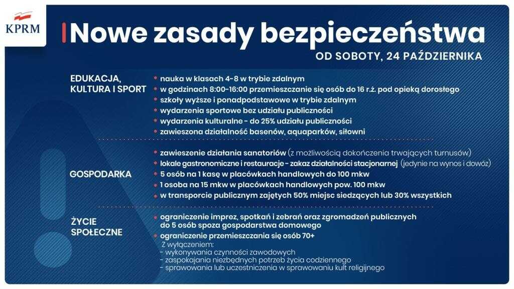 Na konferencji prasowej premier przekazał, że od soboty 24 października cała Polska staje się strefą czerwoną. – Będą w niej obowiązywały obostrzenia jakie były dotąd w strefie czerwonej – tłumaczył.