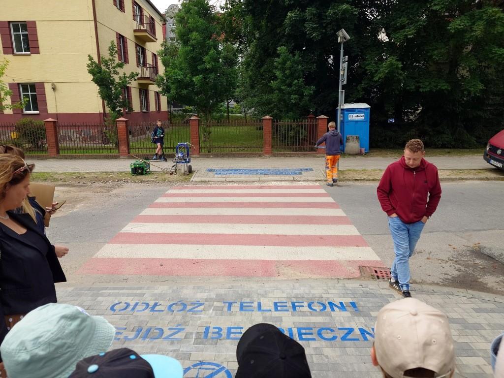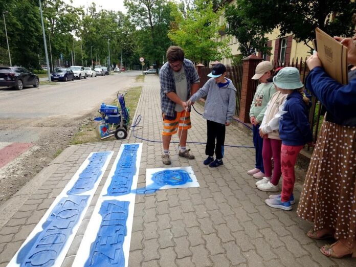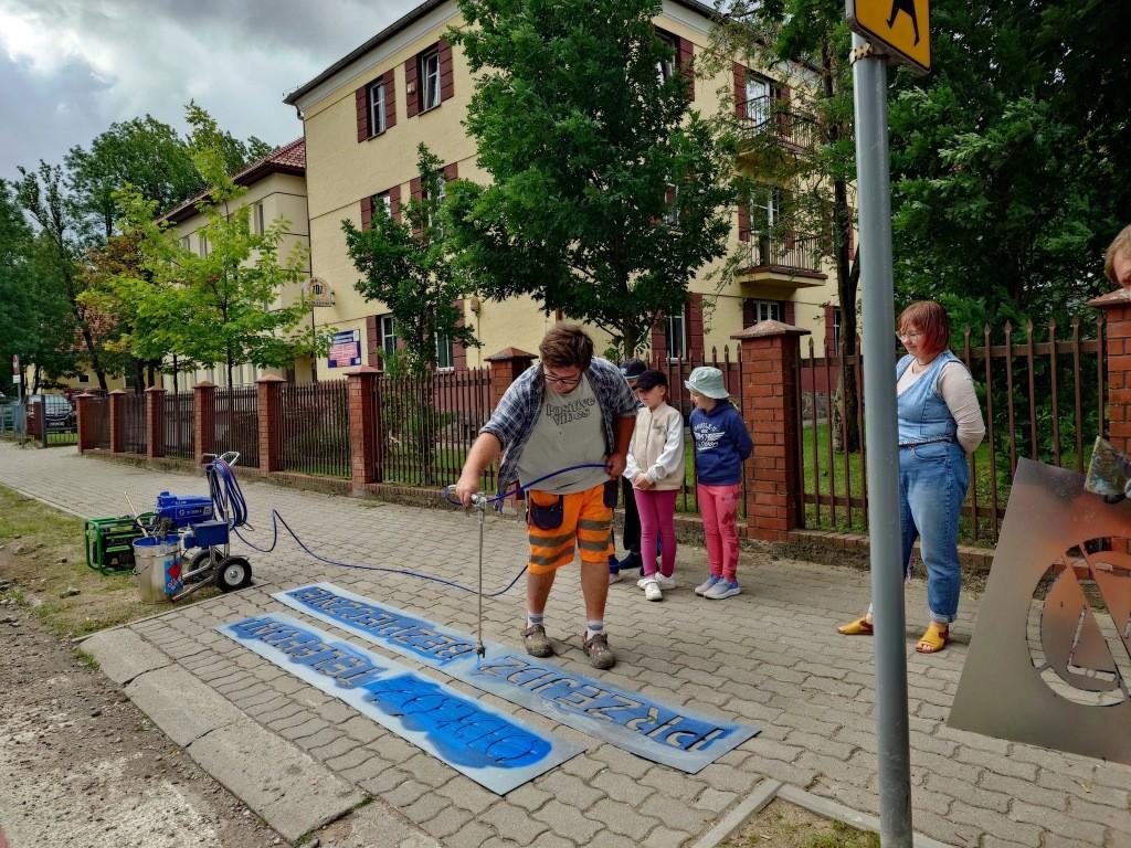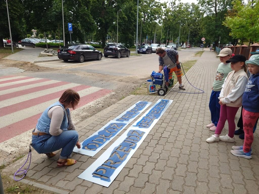 W poniedziałek (24 czerwca) kolejne napisy zostały wymalowane w pobliżu Szkoły Podstawowej nr 1 im. św. Jana Pawła II w Giżycku. W akcję zaangażowali się uczniowie, którzy aktywnie uczestniczyli w nanoszeniu szablonów i poznawali zasady bezpiecznego poruszania się po drogach.