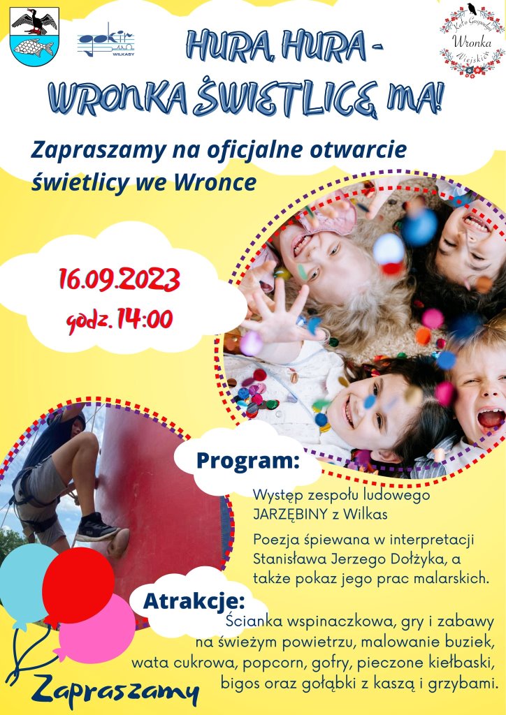 Oficjalne otwarcie Świetlicy Wiejskiej we Wronce [16 września] 15 września 2023016 września (sobota) o godzinie 14:00 odbędzie się oficjalne otwarcie Świetlicy Wiejskiej we Wronce. Szczegóły wydarzenia poniżej na grafice.