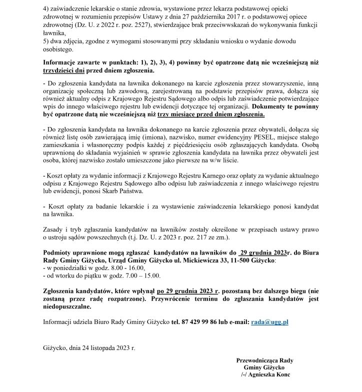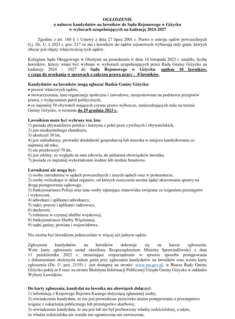 Ogłoszenie o naborze kandydatów na ławników do Sądu Rejonowego w Giżycku 24 listopada 20230OGŁOSZENIE o naborze kandydatów na ławników do Sądu Rejonowego w Giżycku w wyborach uzupełniających na kadencję 2024-2027. Treść ogłoszenia poniżej.