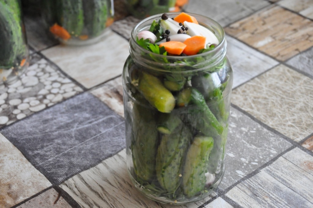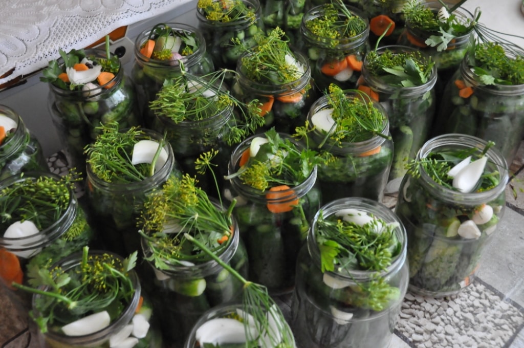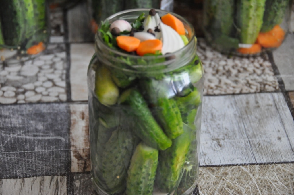 Do każdego słoika wkładamy nać selera i pietruszki, baldachim kopru, kilka plasterków marchewki i cebuli, dodajemy czosnek, trochę gorczycy i ziele angielskie. Umyte ogórki, układamy ciasno, w pozycji pionowej w słoikach. Z podanych składników przygotowujemy zalewę i napełniamy nią przygotowane słoiki z ogórkami, na wierzchu ponownie układamy natkę selera, pietruszkę i koper oraz marchewkę i cebulę. Zakręcamy słoiki (tu przyda się męska ręka ) i pasteryzujemy 5-8 minut od momentu zagotowania się wody.