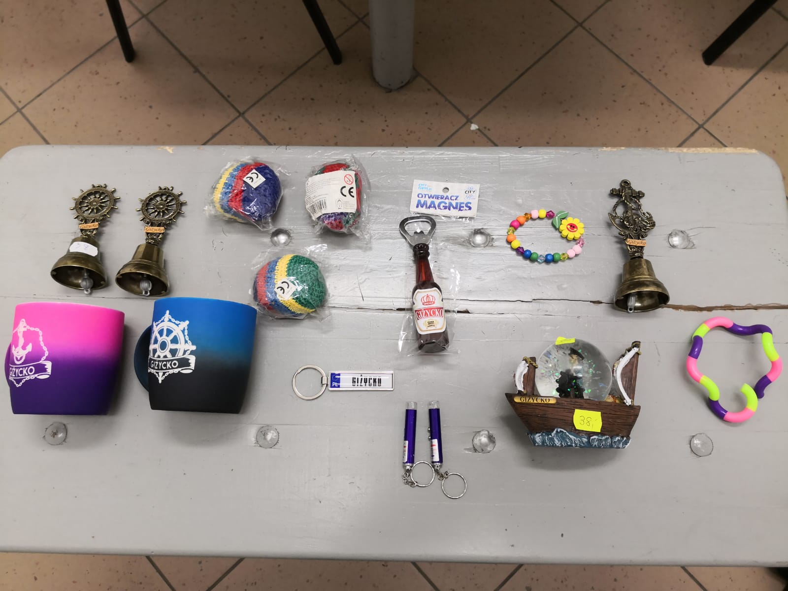 Po przeszukaniu osób i ich bagażu policjanci ujawnili przedmioty pochodzące z kradzieży. W plecakach były pamiątki ze stoiska. Pokrzywdzony rozpoznał swoje przedmioty m.in. kubki, magnesy, breloki oraz dzwonki z napisem Giżycko.