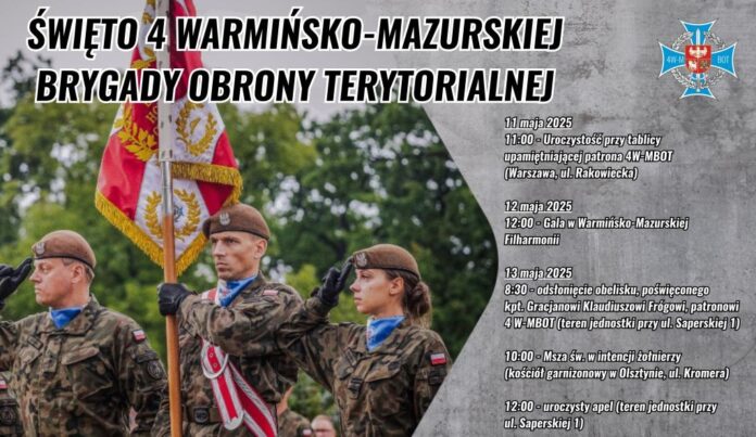 Terytorialsi z Warmii i Mazur będą celebrowali święto swojej brygady przez trzy dni: rozpoczną 11 maja w Warszawie, uroczystością upamiętniającą patrona 4W- MBOT kpt. Gracjana Klaudiusza Fróga. 12 maja zorganizują galę w Filharmonii Warmińsko-Mazurskiej w Olsztynie, dzień później – 13 maja – między innymi uroczysty apel na terenie jednostki.