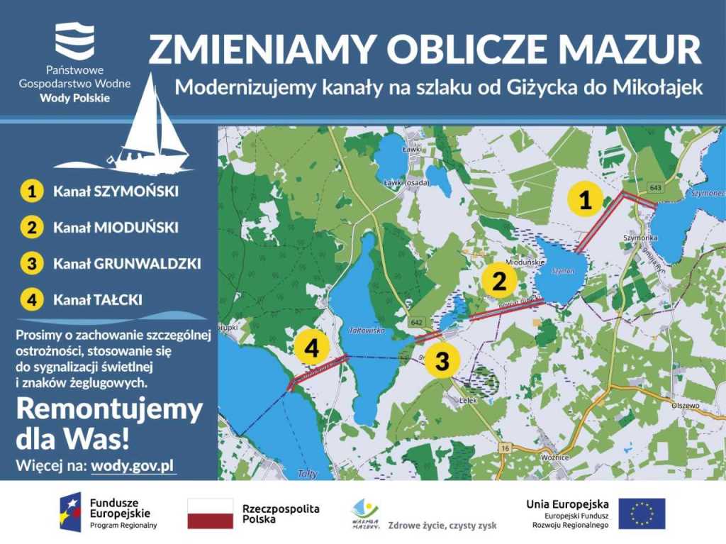 Ze względu na remont 4 kanałów na szlaku od Giżycka do Mikołajek możliwe są utrudnienia w ruchu oraz wydłużony czas oczekiwania na wejście do kanałów. Należy jednak podkreślić, że mimo prowadzonych prac kanały przez cały sezon żeglugowy pozostaną otarte dla ruchu i będzie można nimi pływać.