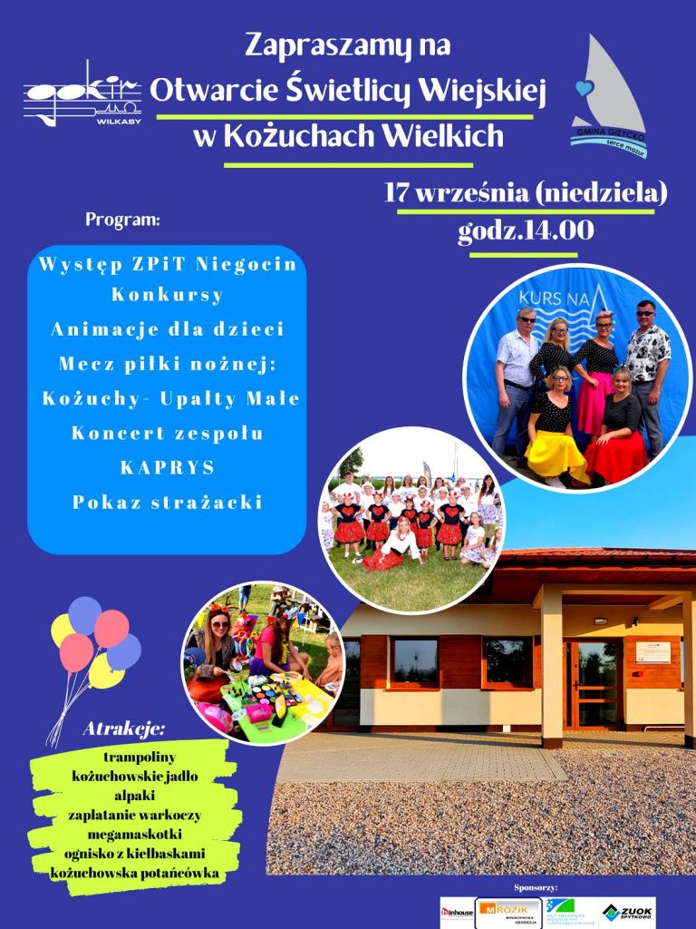 Oficjalne otwarcie Świetlicy Wiejskiej w Kożuchach Wielkich [17 września] 15 września 2023017 września (niedziela) o godzinie 14:00 odbędzie się oficjalne otwarcie Świetlicy Wiejskiej w Kożuchach Wielkich. Szczegóły wydarzenia poniżej na grafice.