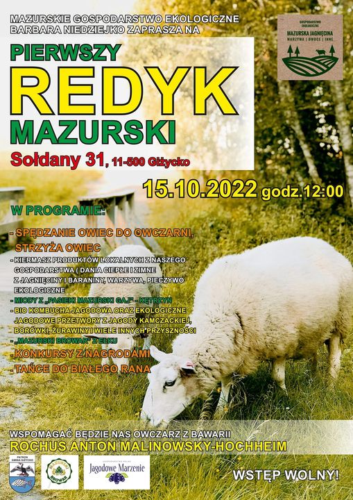 Mazurskie Gospodarstwo Ekologiczne Barbara Niedziejko zaprasza na Pierwszy Redyk Mazurski. Zarezerwujcie sobie czas 15 października 2022 roku (sobota). Wydarzenie odbędzie się w Sołdanach nr 31, Gmina Giżycko, godz. 12:00. WSTĘP WOLNY.