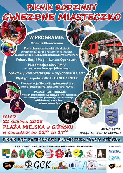 Zapraszamy wszystkich serdecznie do wspólnej zabawy podczas Pikniku Rodzinnego „GWIEZDNE MIASTECZKO”, który odbędzie się w sobotę 22 sierpnia na plaży miejskiej w Giżycku od godz. 12.00. Organizatorzy oraz partnerzy akcji przygotowali mnóstwo atrakcji w tym dniu. Każdy znajdzie coś ciekawego dla siebie:) Będzie mobilne planetarium, spektakl teatralny, pokazy artystyczne, gry i zabawy rekreacyjne, prezentacja służb bezpieczeństwa, specjalną atrakcją będą też psy szkolone do akcji ratowniczych!