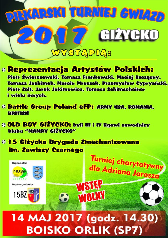 W niedzielę, 14 maja o godzinie 14.30, na boisku Orlik przy Szkole Podstawowej nr 7 odbędzie się „Piłkarski Turniej Gwiazd” połączony z akcją charytatywną na rzecz giżycczanina Adriana Jarosza.