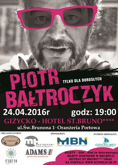 Jeden z najpopularniejszych kabareciarzy w Polsce wystąpi 24.04.2016 r. w Oranżerii Portowej Hotelu St. Bruno**** w Giżycku.