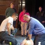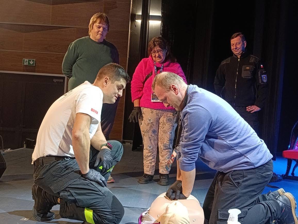 Nie zabrakło także integracyjnych chwil przy ognisku, gdzie na parkingu przed RPEKiT od godziny 13:00 mieszkańcy wspólnie piekli kiełbaski, ciesząc się rozmowami i ciepłą atmosferą. Równocześnie w sali widowiskowej odbywało się szkolenie z zakresu Kwalifikowanej Pierwszej Pomocy, podczas którego uczestnicy uczyli się zasad resuscytacji krążeniowo-oddechowej. To praktyczne i edukacyjne spotkanie przyciągnęło osoby chcące podnieść swoje kompetencje w ratowaniu życia.