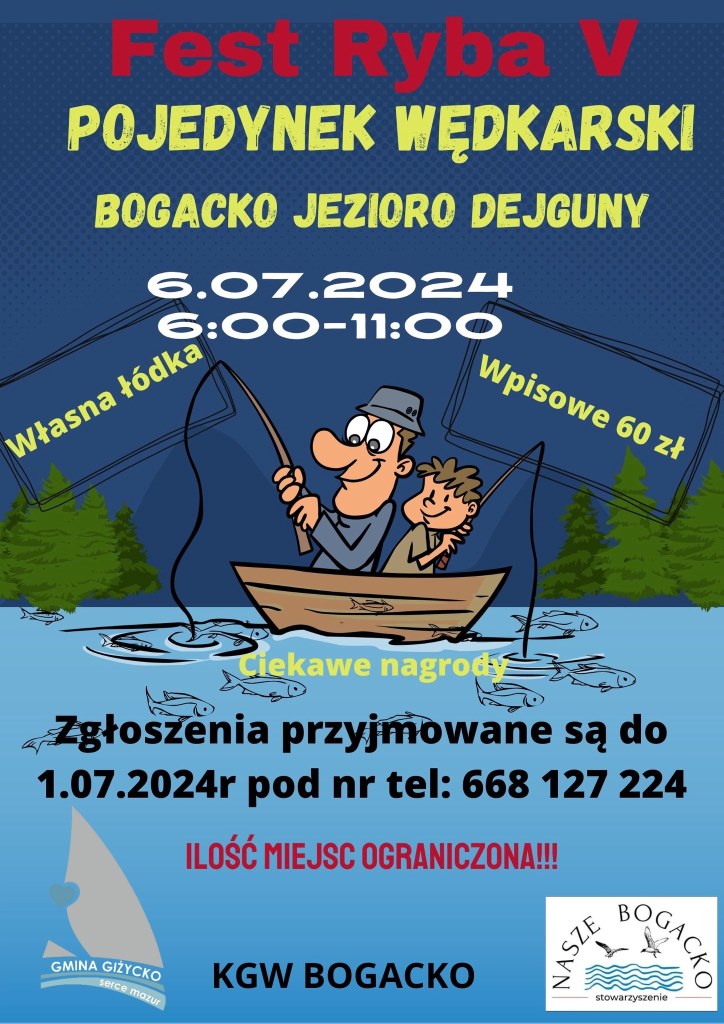 Stowarzyszenie Nasze Bogacko oraz Koło Gospodyń Wiejskich Bogacko w ramach V edycji Festynu Fest Ryba 2024 zapraszają na pojedynek wędkarski.
