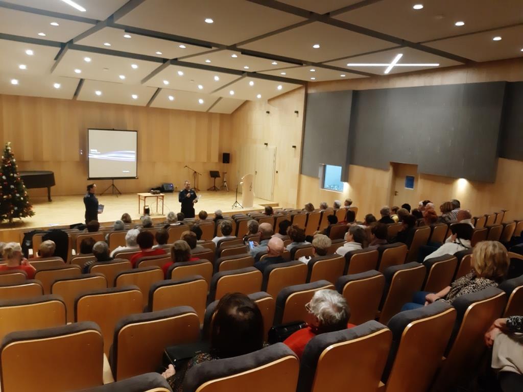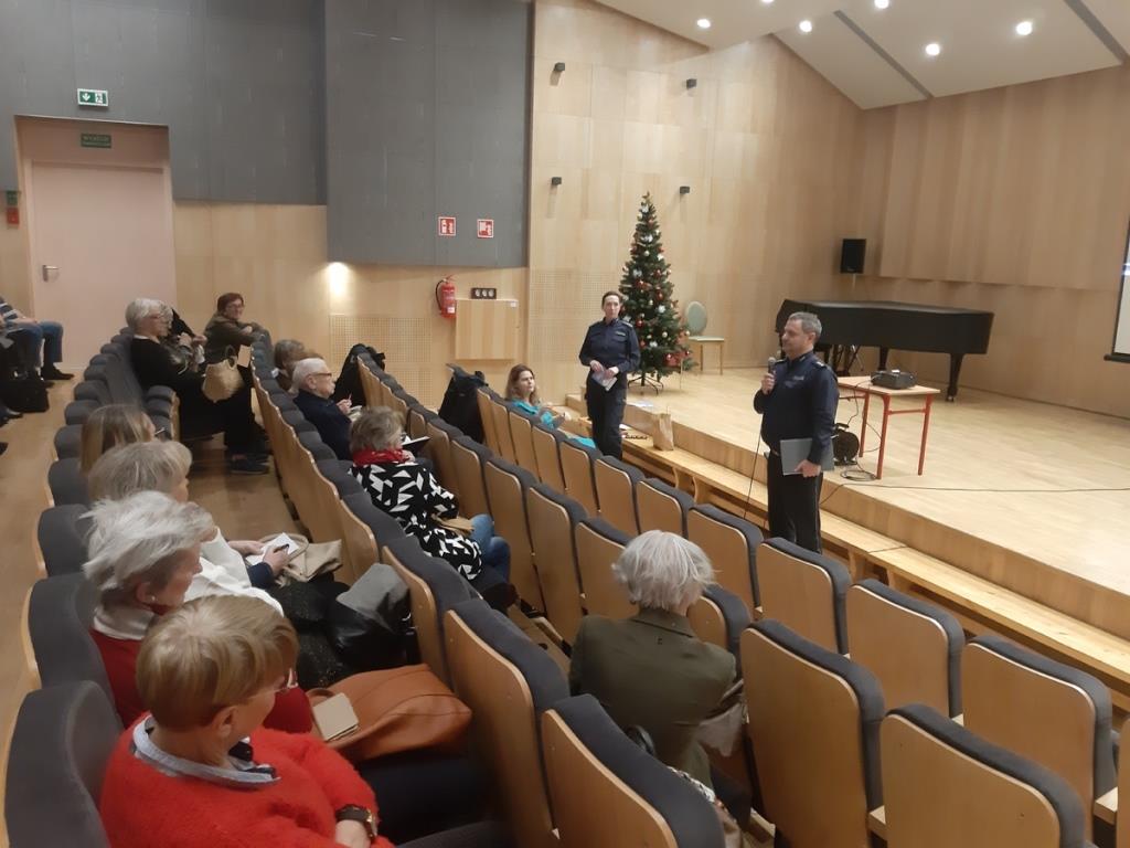 W sali koncertowej Państwowej Szkoły Muzycznej zgromadziło się kilkudziesięciu seniorów, którzy mieli możliwość wysłuchać kom. Jacka Tarnackiego Naczelnika Wydziału Prewencji i Ruchu Drogowego KPP w Giżycku oraz st. asp. Mariolę Jagodzińską Kierownika Rewiru Dzielnicowych KPP w Giżycku, którzy w codziennej służbie mają do czynienia z osobami pokrzywdzonymi i zagrożeniami jakie czyhają na osoby w życiu codziennym. Funkcjonariusze także dbają o bezpieczeństwo seniorów.