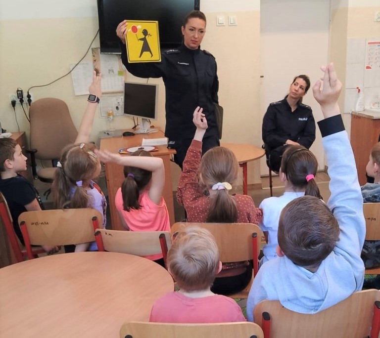 Policjantki podczas spotkania przekazały najmłodszym najważniejsze zasady dotyczące ich bezpieczeństwa na drodze oraz zwróciły szczególną uwagę na właściwe zachowanie się w szkole.