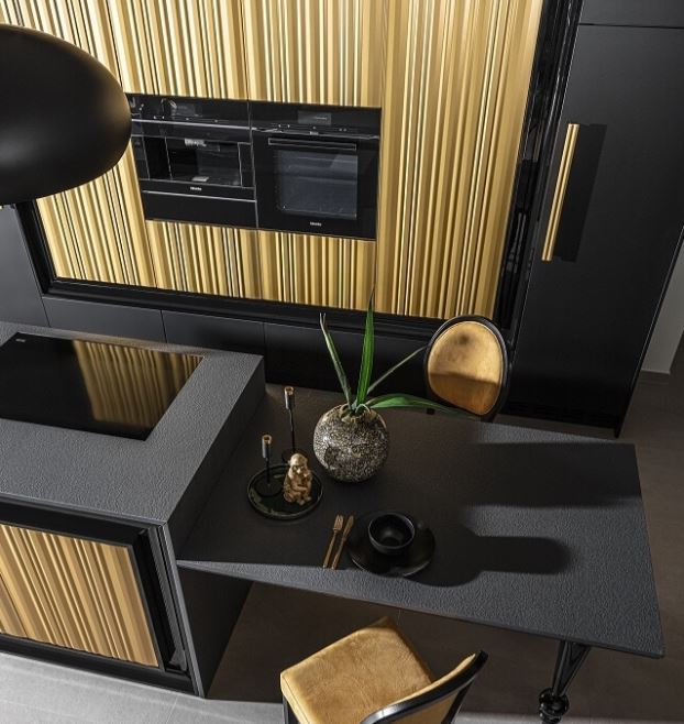 Połączenie dwóch konkurujących ze sobą kolorów, złota z czernią, to rozwiązanie dla klientów szukających czegoś zupełnie nowego. W kuchni Ariana mogą to odnaleźć. Fazowane szkło dopełnia całość, która zachowuje ergonomię i funkcjonalność. Wyrazistość tego projektu polega na zestawieniu nie tylko kolorów, ale przede wszystkim faktur. Fronty i blaty to dwa różne wzory, jednak w połączeniu ze sobą sprawiają wrażenie nierozłącznych.