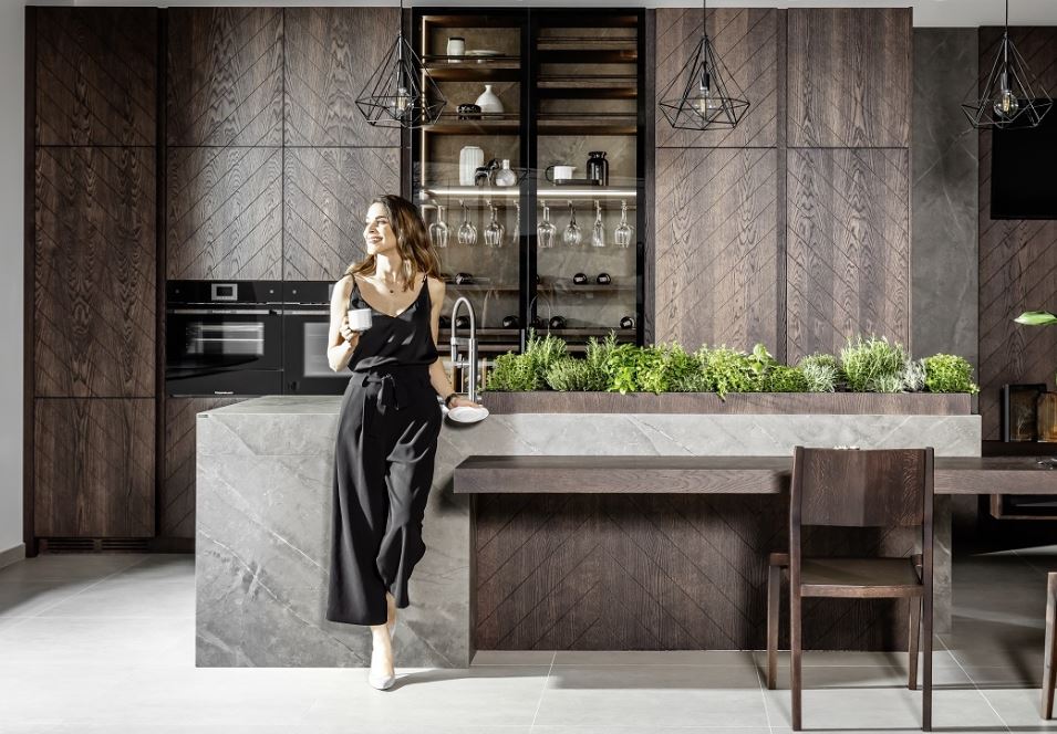 Kuchnia Marsala utrzymana jest w przenikliwym, ciemnym kolorze drewna, idealnie więc spełni swoją funkcję w większych pomieszczeniach. Wyjątkowy miniogródek na zioła wydobędzie blask z wyrafinowanego drewna. Kunszt wykonania tego projektu podkreśla szlachetność materiałów i otaczającą naturę.
