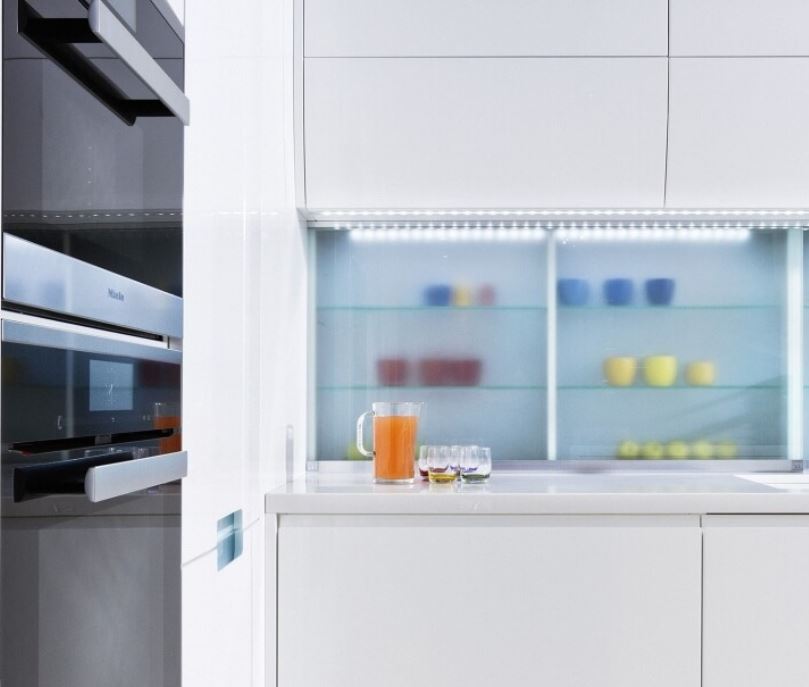 Błyszczące fronty wspaniale odbijają światło. Pionowe frezowania nadają kuchni smukłość i wyjątkowy charakter. Podświetlane uchwyty sprawiają, że można się w niej poczuć jak w futurystycznym świecie pełnym nieodkrytych rozwiązań. Za piaskowanym szkłem możemy dyskretnie ukryć to, co ma być zauważalne, ale skrywać pewną tajemnicę. Całość projektu to spełnienie marzeń o nowoczesnym, przejrzystym wnętrzu.