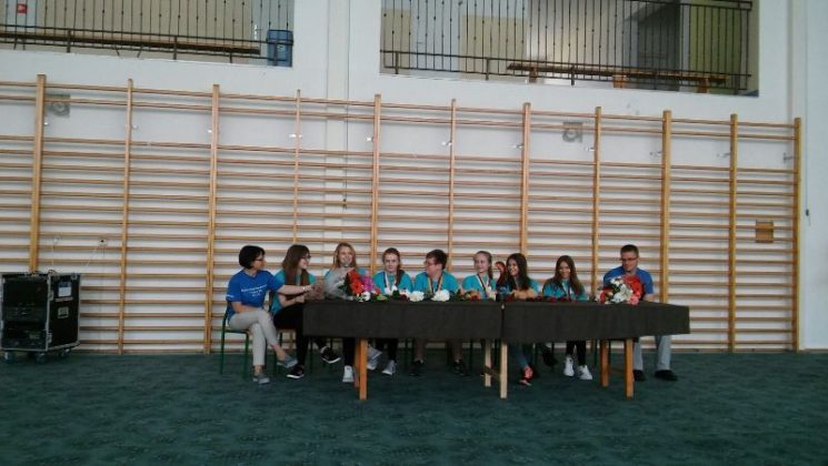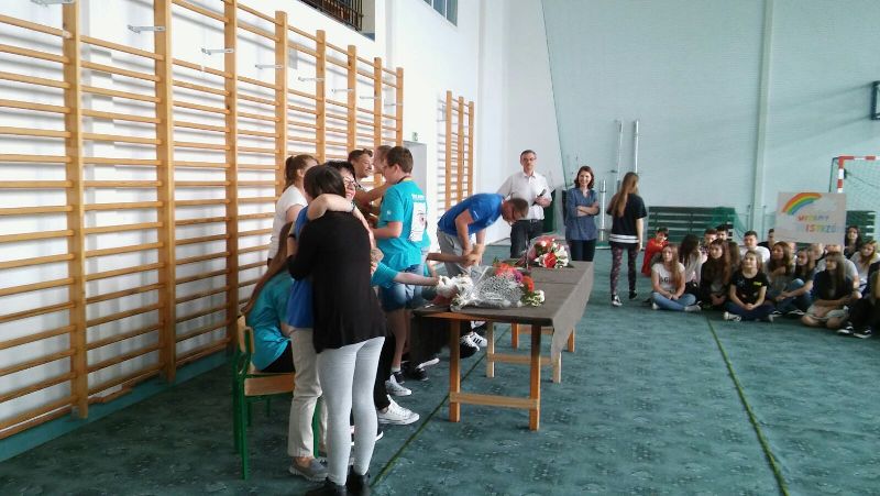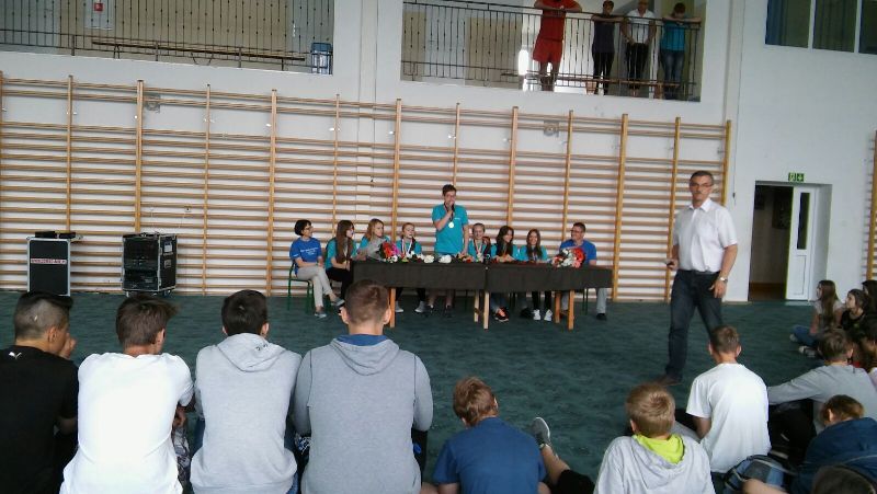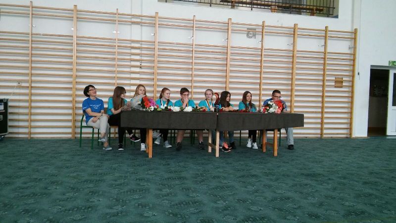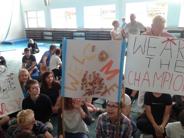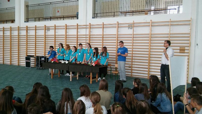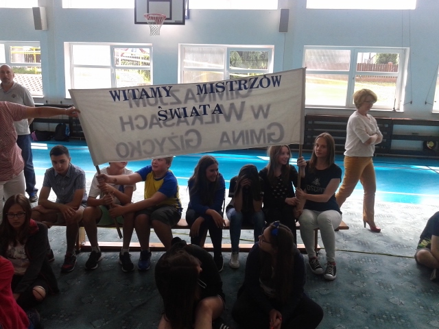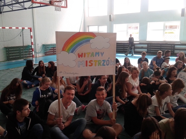 Wszyscy zgromadzeni na sali gimnastycznej przygotowani w banery powitalne, kwiaty i maskotki przywitali drużynę gromkimi brawami. Następnie zaciekawiona społeczność uczniowska zadawała pytania dotyczące pobytu w Stanach oraz zmaganiach w Global Finals 2016. Po wyczerpaniu czasu na pytania nastąpiło uroczyste przekazanie trofeum panu dyrektorowi Zygmuntowi Marciniakowi.