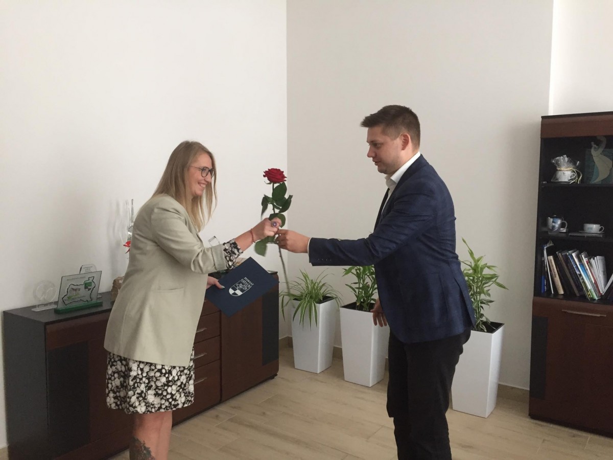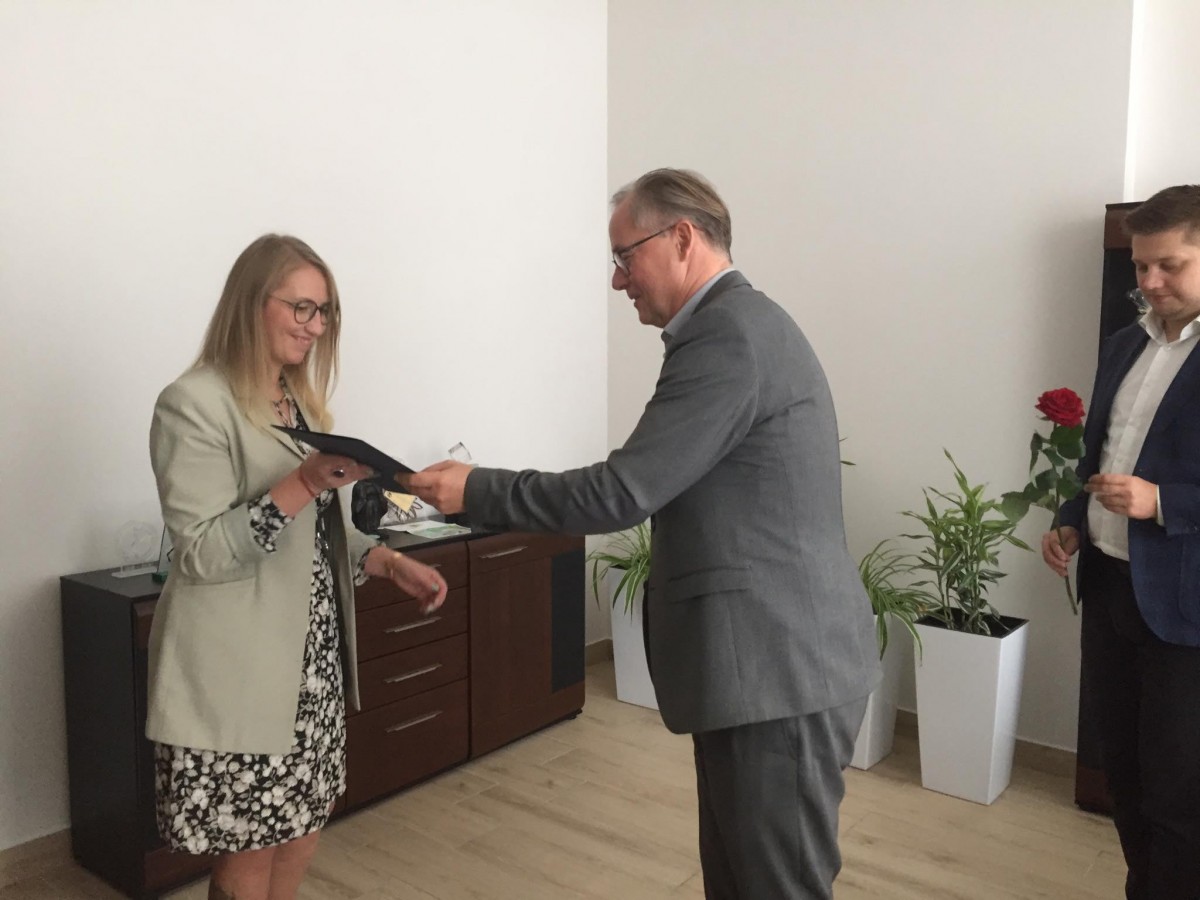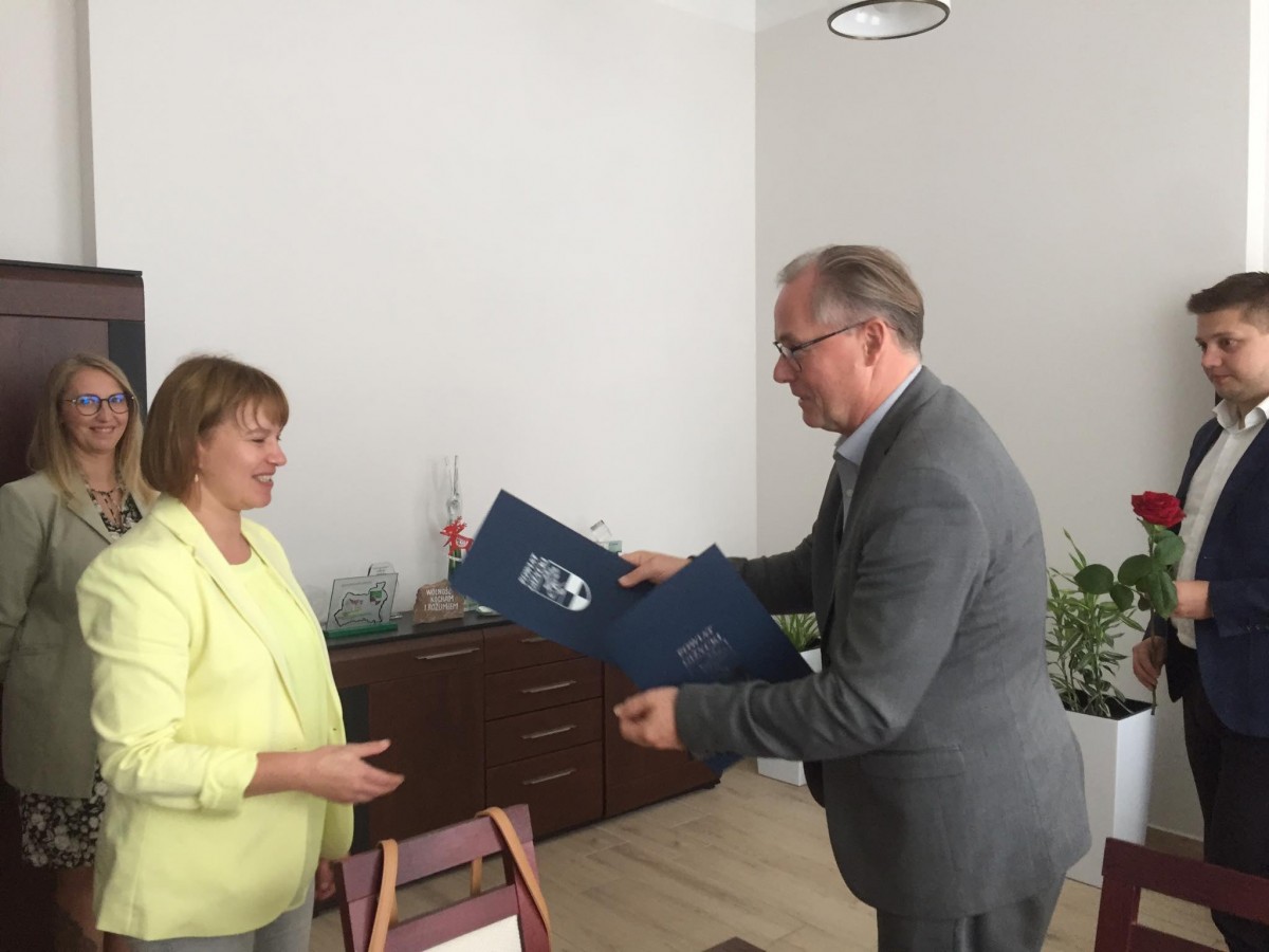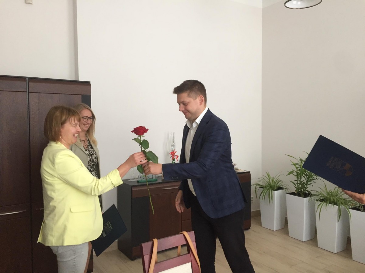 27 sierpnia 2021 r. Starosta Mirosław Dariusz Drzażdżewski oraz Wicestarosta Mateusz Sieroński wręczyli uchwały Zarządu Powiatu powołujące na stanowiska nowych dyrektorów.