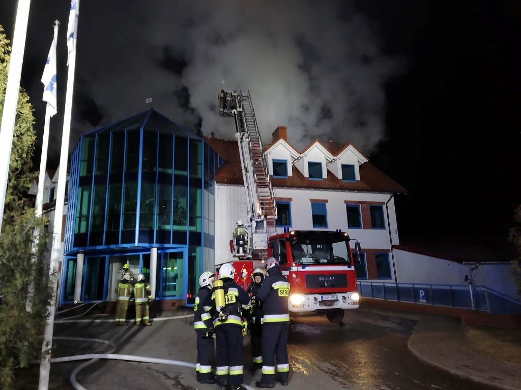 Na miejsce pożaru jako pierwsi przybyli druhowie z OSP Ryn. W chwili przyjazdu strażaków pożar obejmował całą powierzchnię dachu budynku biurowego. Zagrożone pożarem były także magazyny znajdujące się w pobliżu płonącego biurowca.