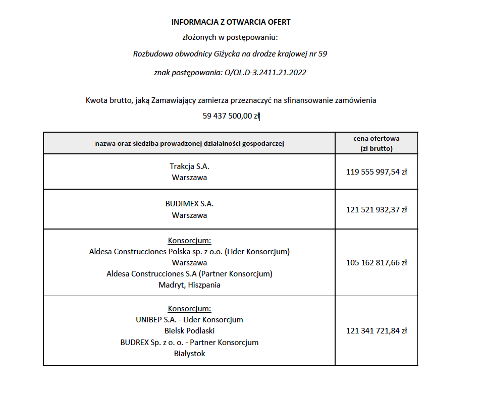 Najniższą cenę – 105,2 mln zł – zaproponowało konsorcjum firm Aldesa Construcciones Polska z Warszawy oraz Aldesa Construcciones z Madrytu, najwyższą – 121,5 mln zł – firma Budimex z Warszawy.