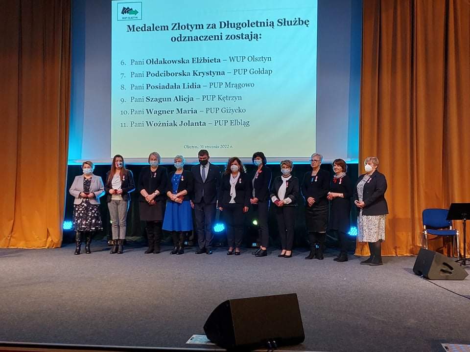Podczas uroczystości zasłużonym pracownikom urzędów pracy wręczono odznaczenia, w tym Złote Medale za Długoletnią Służbę. Takim medalem odznaczona została Pani Maria Wagner oraz Pani Beata Kraszyńska z Powiatowego Urzędu Pracy w Giżycku.