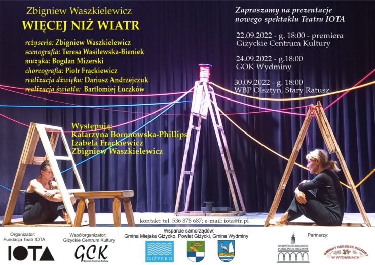 Zapraszamy 22 września o godzinie 18:00 do Giżyckiego Centrum Kultury, gdzie odbędzie się uroczysta premiera spektaklu “Więcej niż wiatr” Teatru IOTA w reżyserii Zbigniewa Waszkielewicza.