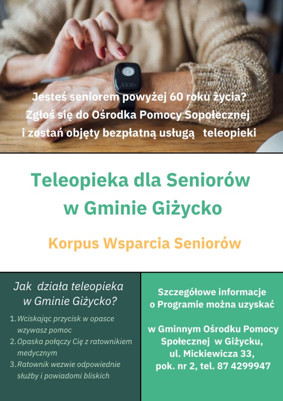 Więcej informacji dotyczących tzw. „opasek bezpieczeństwa” oraz realizacji Programu pn. „Korpus Wsparcia Seniorów” można uzyskać w Gminnym Ośrodku Pomocy Społecznej w Giżycku, ul. Mickiewicza 33, pok. nr 2 lub pod nr tel. 87 4299947.
