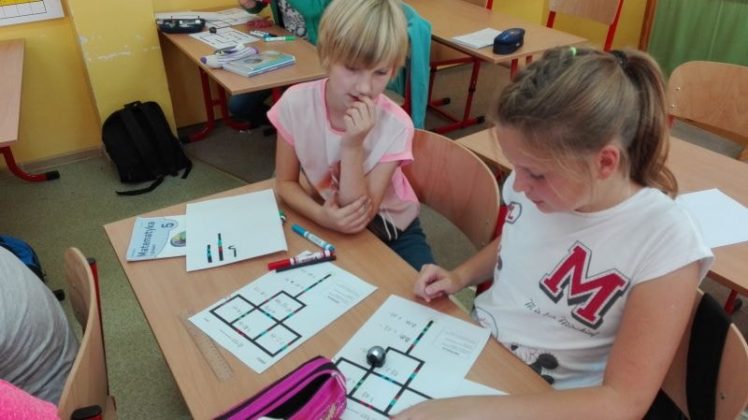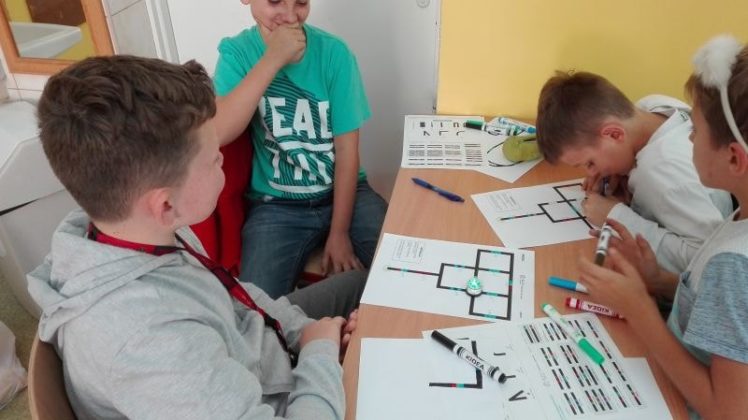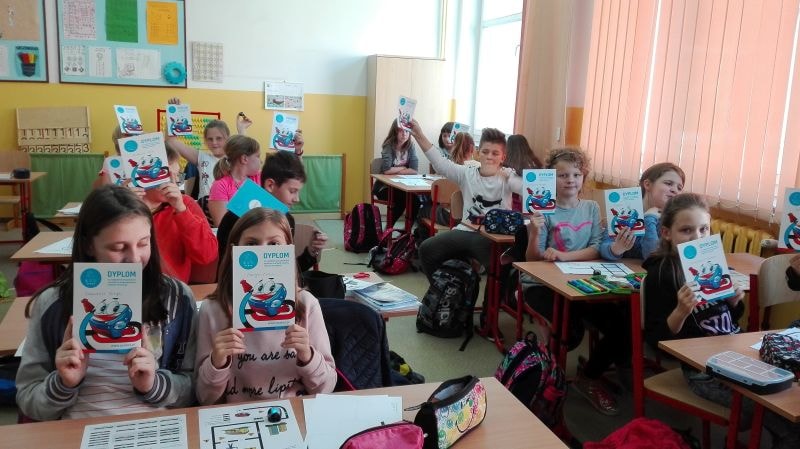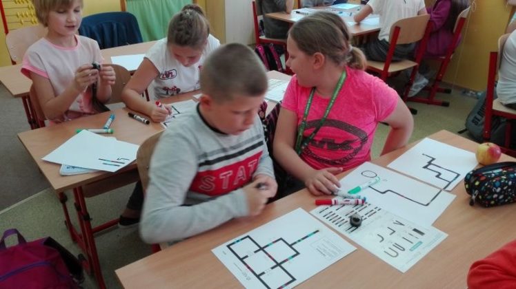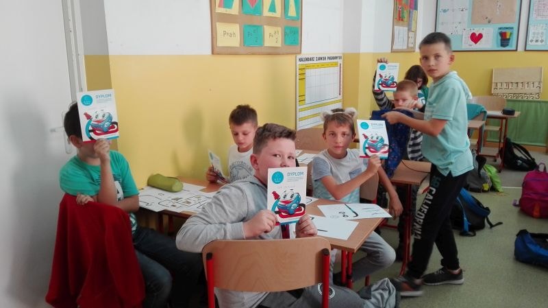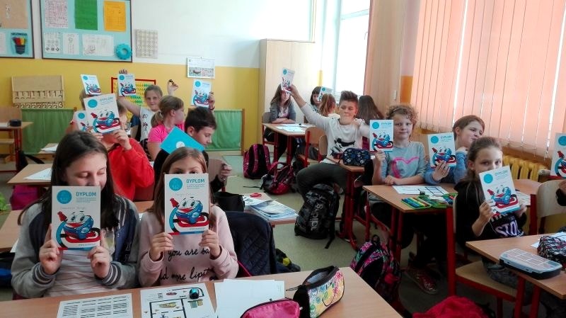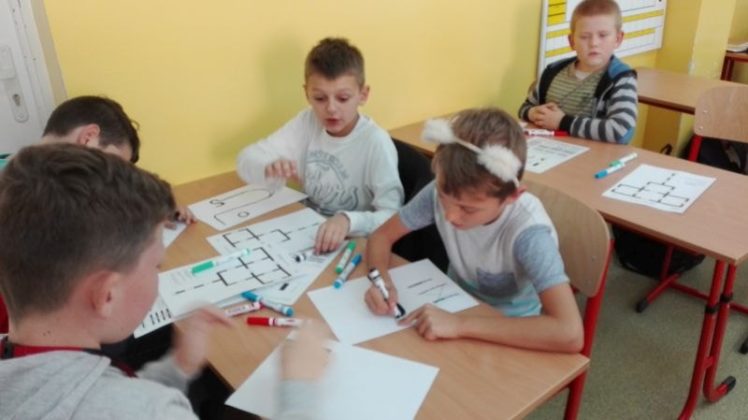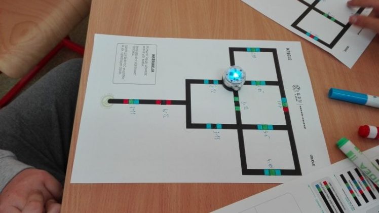 Uczniowie pracowali w grupach dwuosobowych. Rysowały trasy zgodnie z kodem, tak kierując robotem, by dotarł do celu. Jednym z zadań było przećwiczenie tabliczki mnożenia w czasie zaprogramowanym dla Ozobota. Ćwiczenia wymagały cierpliwości i staranności, źle narysowane kody nie były czytane poprawnie przez robota. Wszyscy pracowali wytrwale, każdy chciał zobaczyć efekt swojej pracy. Na koniec każdy dostał pamiątkowy dyplom za osiągnięcie wspaniałych wyników w programowaniu robotów. Dzieci ćwiczyły z dużym zaangażowaniem, nie zwracając uwagi, że już koniec lekcji…