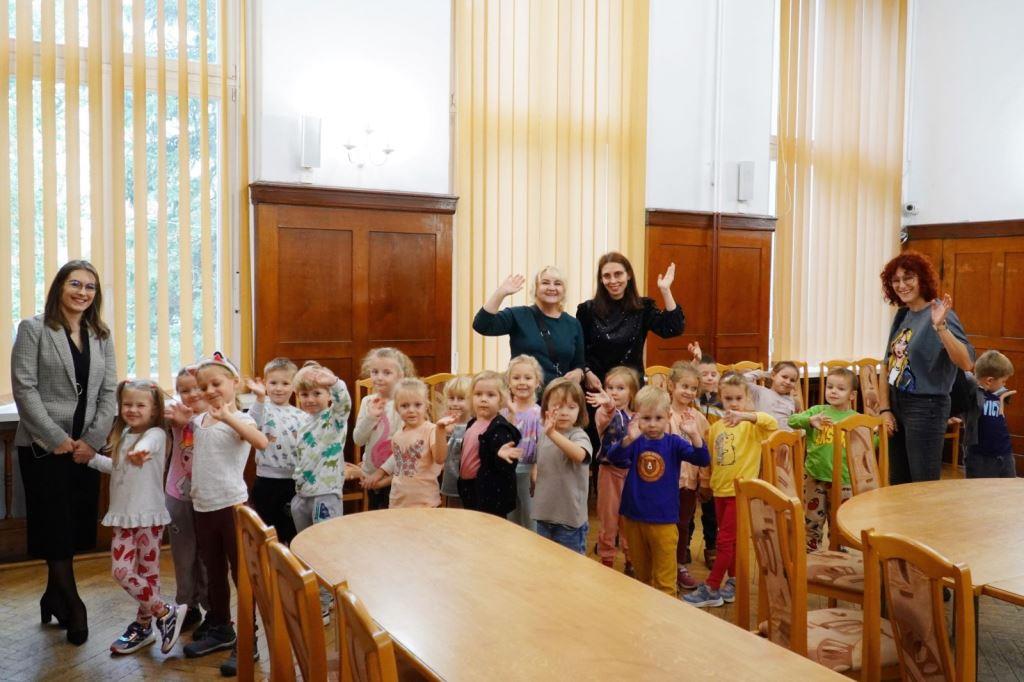 Kolejnym ciekawym etapem wycieczki była wizyta w sali ślubów Urzędu Stanu Cywilnego, przedszkolaki z uwagą wysłuchały Pani Kierownik USC opowiadającej o swojej pracy.