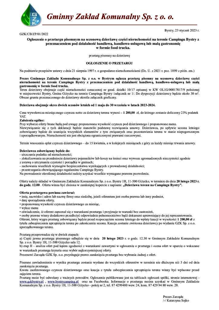 Przetarg na sezonową dzierżawę części nieruchomości na terenie Campingu Bystry 23 stycznia 20230Ogłoszenie o przetargu pisemnym na sezonową dzierżawę części nieruchomości na terenie Campingu Bystry z przeznaczeniem pod działalność handlową, handlowo-usługową lub małą gastronomię w formie food trucka. Szczegóły ogłoszenie poniżej na grafice.